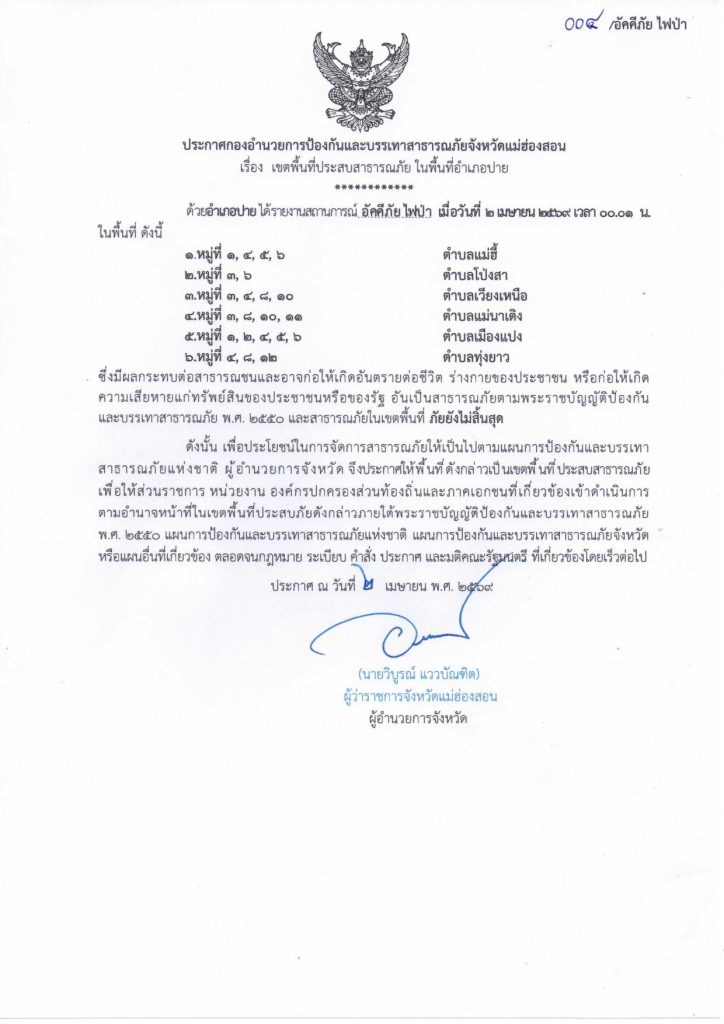 เมื่อวันที่ 3 เมษายน 2569 เวลา 00.01 น.กองอำนวยการป้องกันและบรรเทาสาธารณภัยจังหวัดแม่ฮ่องสอน ได้ประกาศให้พื้นที่ 2 อำเภอในจังหวัดแม่ฮ่องสอน เป็นเขตพื้นที่ประสบสาธารณภัย ได้แก่ อำเภอปาย และ อำเภอแม่สะเรียง ซึ่งมีผลกระทบต่อสาธารณชนและอาจก่อให้เกิดอันตรายต่อชีวิต ร่างกายของประชาชน หรือก่อก่อให้เกิดความเสียหายแก่ทรัพย์สินของประชาชนหรือของรัฐ อันเป็นสาธารณภัยตามพระราชบัญญัติป้องกันและบรรเทาสาธารณภัย พ.ศ. ๒๕๕๐ และสาธารณภัยในเขตพื้นที่ ภัยยังไม่สิ้นสุดดังนั้น เพื่อประโยชน์ในการจัดการสาธารณภัยให้เป็นไปตามแผนการป้องกันและบรรเทาสาธารณภัยแห่งชาติ ผู้อำนวยการจังหวัด จึงประกาศให้พื้นที่ ดังกล่าวเป็นเขตขึ้นที่ ประสบสาธาธารณภัยเพื่อให้ส่วนราชการ หน่วยงาน องค์กรปกครองส่วนท้องถิ่นและภาคเอกชนที่เกี่ยวข้องเข้าดำเนินการตามอำนาจหน้าที่ในเขตพื้นที่ประสบภัยดังกล่าวภายใต้พระราชบัญญัติป้องกันและบรรเทาสาธารณภัยพ.ศ. ๒๕๕๕๐ แผนการป้องกันและบรรเทาสาธารณภัยแห่งชาติ แผนการป้องกันและบรรเทาสาธาธารณภัยจังหวัดหรือแผนอื่นที่เกี่ยวข้อง ตลอดจนกฎหมาย ระเบียบ คำสั่ง ประกาศ และมติคณะรัฐมนนตรี ที่เกี่ยวข้องโดยเร็วต่อไป