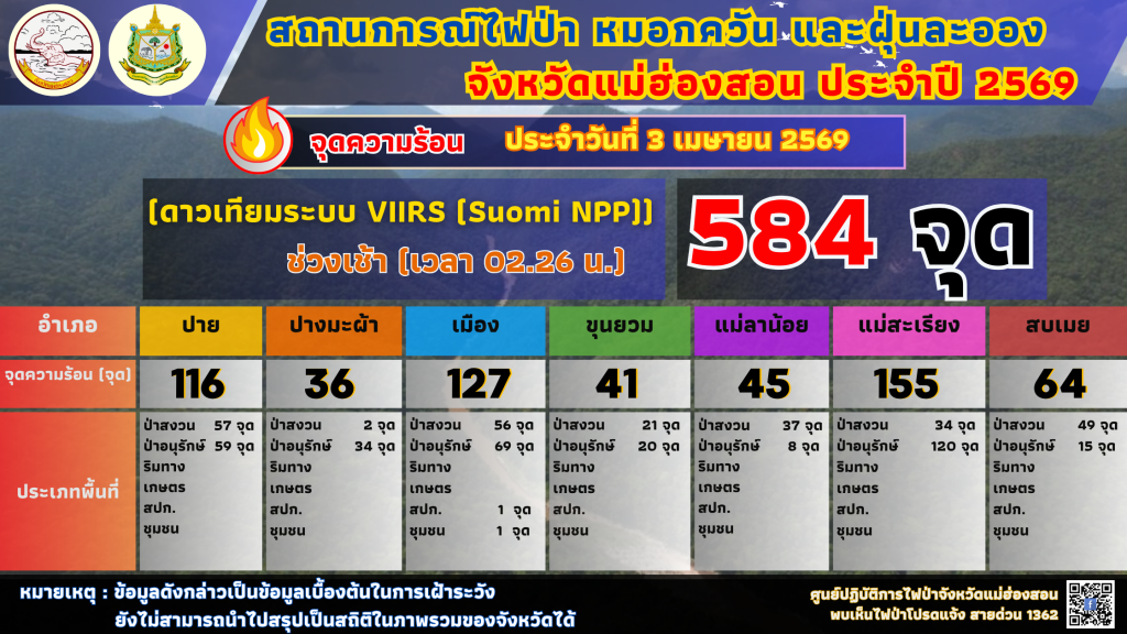 ล่าสุดสถานการณ์ไฟป่าวันนี้ ศูนย์ปฏิบัติการป้องกันและแก้ไขปัญหาไฟป่าฯ จังหวัดแม่ฮ่องสอน ขอรายงานจุดความร้อน (Hotspot) ดาวเทียม Suomi NPP ระบบ VIIRS ประจำวันที่ 3 เมษายน 2569 รอบเช้า เวลา 02.26 น. พบจุดความร้อน 584 จุด