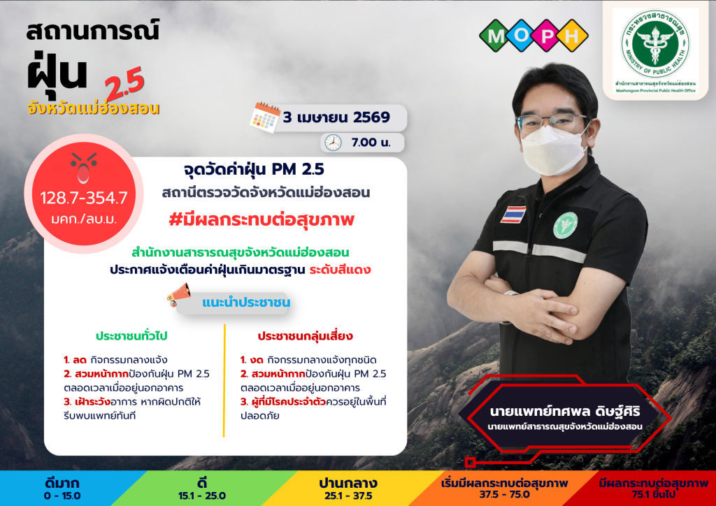 สรุปสถานการณ์ฝุ่น PM2.5 เฉลี่ย 24 ชั่วโมง ณ เวลา 07.00 น. ประจำวันที่ 3 เมษายน 2569 ในพื้นที่รับผิดชอบของสำนักงานสิ่งแวดล้อมและควบคุมมลพิษที่ 1 (เชียงใหม่ เชียงราย ลำพูน แม่ฮ่องสอน) ในพื้นที่จังหวัดแม่ฮ่องสอน 1. ต.จองคำ อ.เมือง จ.แม่ฮ่องสอน PM2.5 = 128.7 มคก./ลบ.ม. 2. ต.แม่สะเรียง อ.แม่สะเรียง จ.แม่ฮ่องสอน PM2.5 = 162.3 มคก./ลบ.ม. 3. ต.เวียงใต้ อ.ปาย จ.แม่ฮ่องสอน PM2.5 = 352.2 มคก./ลบ.ม. ค่ามาตรฐาน PM2.5 เฉลี่ย 24 ชั่วโมง ไม่เกิน 37.5 มคก./ลบ.ม.