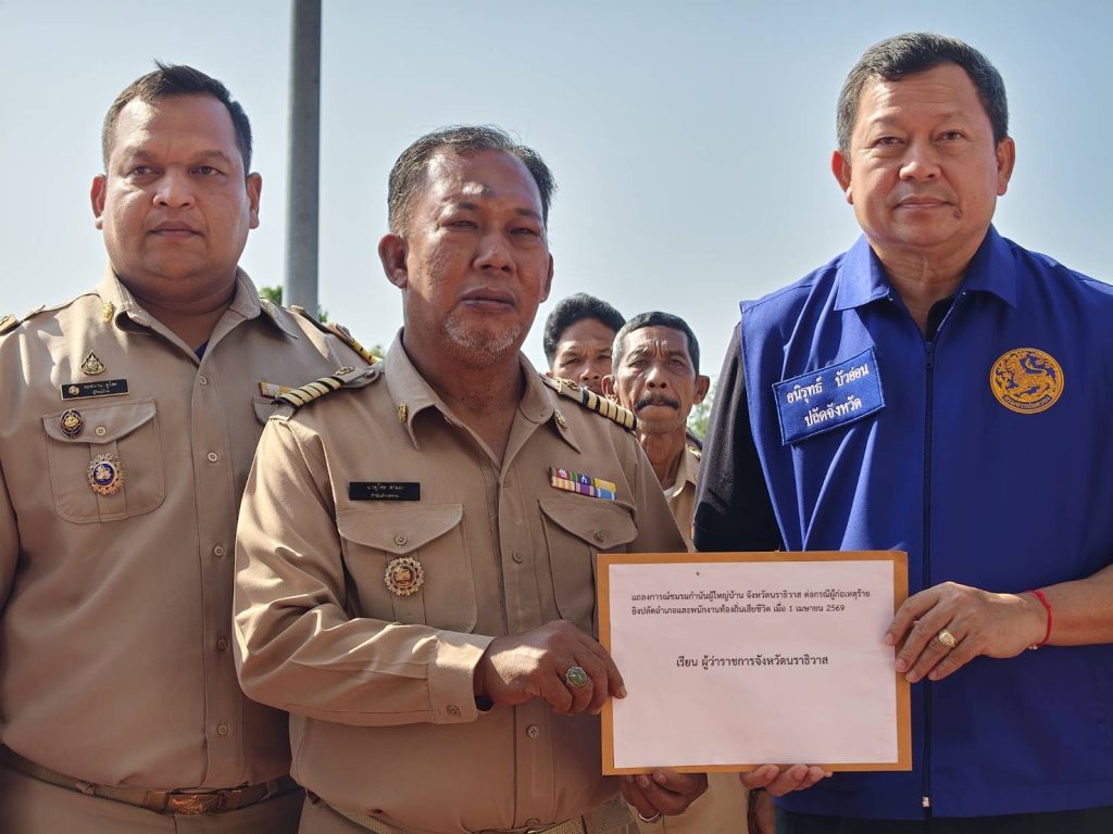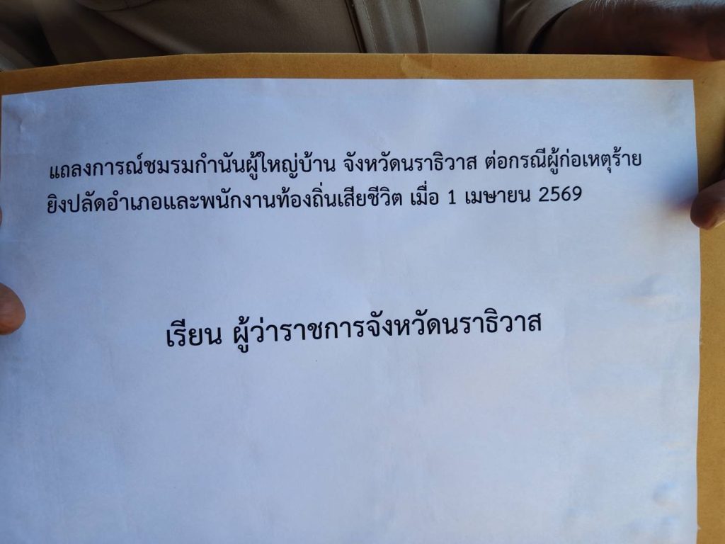 ที่ศาลากลาง จ.นราธิวาส แห่งที่ 2 วานนี้ (2 เม.ย.69) นายแวยูโซ๊ะ สาแม กำนัน ต.จวบ อ.เจาะไอร้อง ในฐานะตัวแทนชมรมกำนันผู้ใหญ่บ้าน จ.นราธิวาส ได้นำกำนันผู้ใหญ่บ้าน ทั้ง 77 ตำบล กว่า 500 คน เข้ายื่นหนังสือแถลงการณ์ต่อผู้ว่าราชการจังหวัดนราธิวาส โดย นายอนิรุทร บัวอ่อน ปลัดจังหวัดนราธิวาส เป็นผู้แทนผู้ว่าราชการจังหวัดรับมอบหนังสือแถลงการณ์
