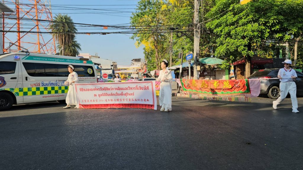 จากนั้นขบวนได้มาถึงมูลนิธิฯก็อัญเชิญองค์พระโพธิสัตว์กวนอิม องค์โป๊ยเซียนโจวซือ เสด็จคุยกี (ฉู่เเต๊) สิ่งศักดิ์สิทธิ์เสด็จเข้าเเท่นที่ประทับที่วิหารจี้เซียวไท้และวิหารแปดเหลี่ยมพระโพธิสัตว์กวนอิม โดยในวันพรุ่งนี้ (7-9 เม.ย.69) ในเวลา 19.00 น. จะมีพิธีเดินเวียนธูป และมีการแสดงงิ้วทุกคืนอีกด้วย