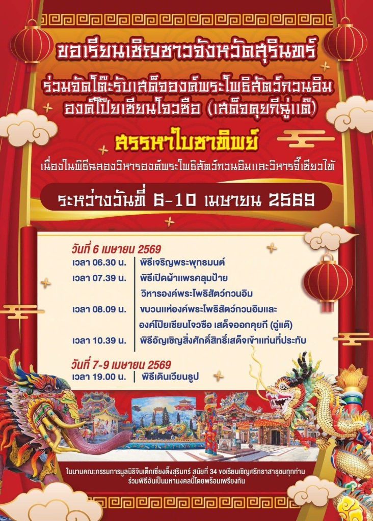 เมื่อเวลา 08.09 น.วันที่ 6 เมษายน 2569 ที่มูลนิธิจิบเต็กเซี่ยงตึ๊งสุรินทร์ ได้จัดขบวนแห่งานมหามงคลเฉลิมฉลองวิหารจี้เซียวไท้และวิหารแปดเหลี่ยมพระโพธิสัตว์กวนอิม ซึ่งมีนายวรากร โรจน์จรัสไพศาล ประธานมูลนิธิจิบเต็กเซี่ยงตึ๊งสุรินทร์ พร้อมด้วยประธานกิตติมศักดิ์ถาวรมูลนิธิฯ รองประธานฯ ที่ปรึกษาฯ และคณะกรรมการมูลนิธิฯ โดยมีนายวรรธนินทร์ ตั้งทวีสิทธิ์ นายกเทศมนตรีเมืองสุรินทร์ ร่วมพิธีอัญเชิญและทรงเจ้า เชิญโหล่วเสี่ยประจำองค์โป๊ยเซียนโจวซือ และพระแม่กวนอิมพันกร ขึ้นประทับยังรถแห่ โดยประกอบพิธีถวายสักการะเจ้าที่ ร่วมใส่ธัญพืช 5 อย่างยังกระถางมังกร ซึ่งงานมหามงคลเฉลิมฉลองวิหารจี้เซียวไท้และวิหารแปดเหลี่ยมพระโพธิสัตว์กวนอิม จัดขึ้นในวันที่ 6 เมษายน 2569 ถึง 10 เมษายน 2569
