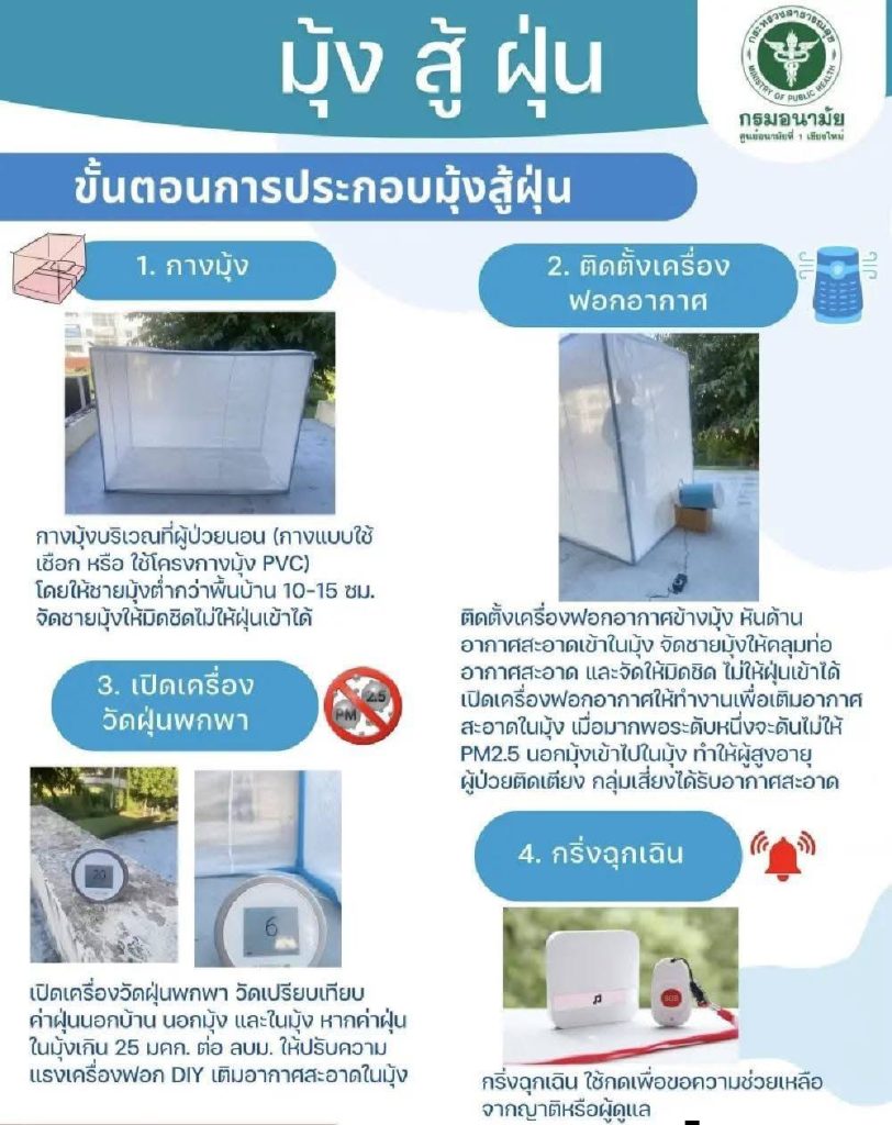 นวัตกรรม “มุ้งสู้ฝุ่น”: ประสานเครือข่ายองค์กรปกครองส่วนท้องถิ่น (อปท.) จัดทำมุ้งสู้ฝุ่นเพื่อช่วยเหลือกลุ่มเปราะบางและผู้ป่วยติดเตียง เบื้องต้นจัดทำแล้วกว่า 60 หลัง