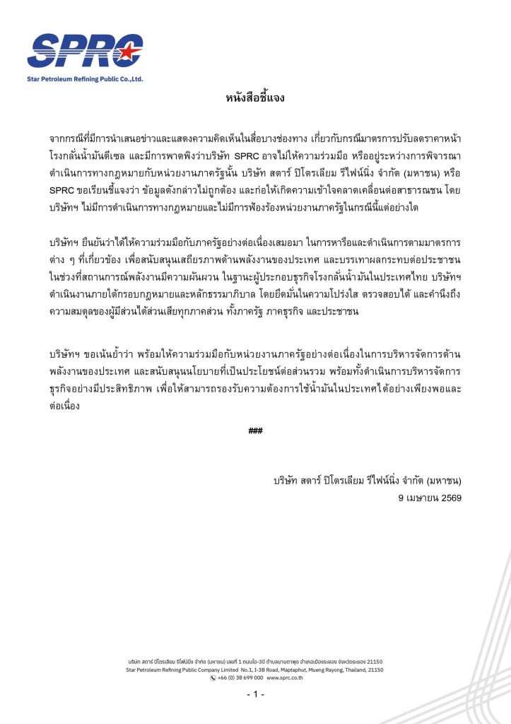 จากกรณีที่มีการนำเสนอข่าวและแสดงความคิดเห็นในสื่อบางช่องทาง เกี่ยวกับกรณีมาตรการปรับลดราคาหน้าโรงกลั่นน้ำมันดีเซล และมีการพาดพิงว่าบริษัท SPRC อาจไม่ให้ความร่วมมือ หรืออยู่ระหว่างการพิจารณาดำเนินการทางกฎหมายกับหน่วยงานภาครัฐนั้น บริษัท สตาร์ ปิโตรเลียม รีไฟน์นิ่ง จำกัด (มหาชน) หรือ SPRC ขอเรียนชี้แจงว่า ข้อมูลดังกล่าวไม่ถูกต้อง และก่อให้เกิดความเข้าใจคลาดเคลื่อนต่อสาธารณชน โดยบริษัทฯ ไม่มีการดำเนินการทางกฎหมายและไม่มีการฟ้องร้องหน่วยงานภาครัฐในกรณีนี้แต่อย่างใด