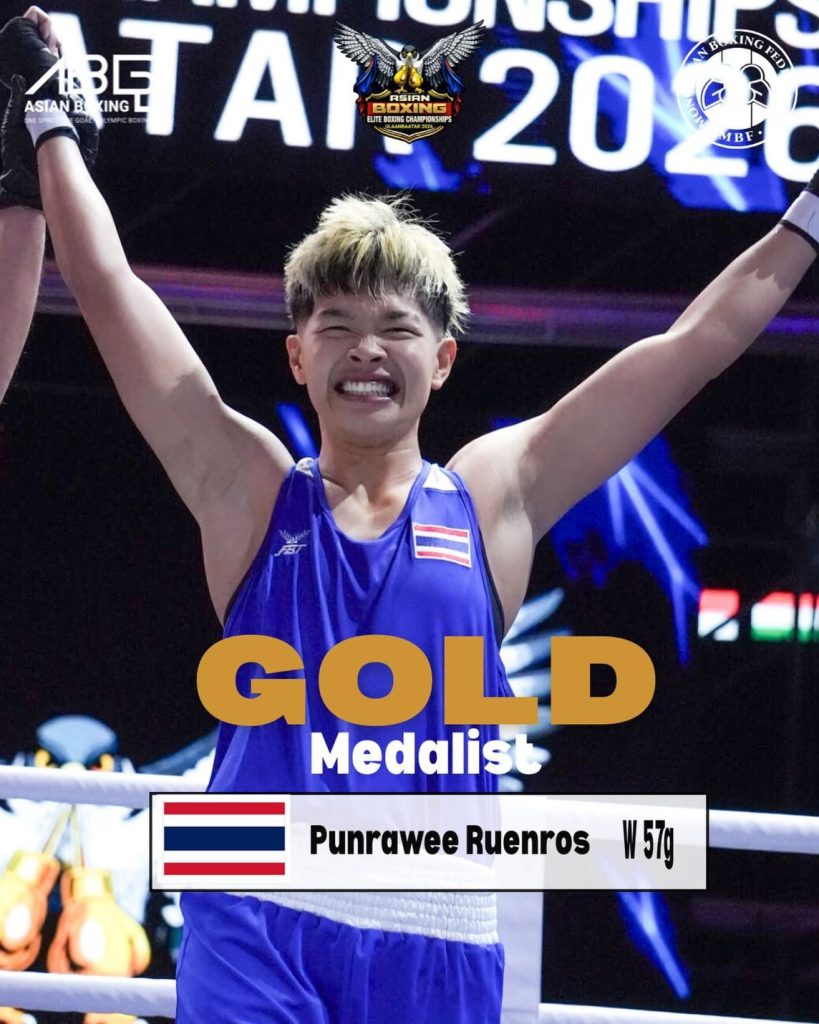 รุ่น 57 กก.”เฟี้ยว”ปุณณ์รวี รื่นรส นักชกสาวไทย ดีกรีเหรียญทอง 2 สมัย โชว์ฟอร์มเยี่ยม ต้อนชนะคะแนน ไจสมิน ไจสมิน นักชกอินเดีย ด้วยสกอร์ 5-0 คว้าเหรียญทองสำเร็จ