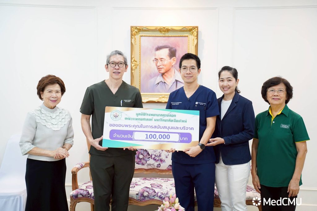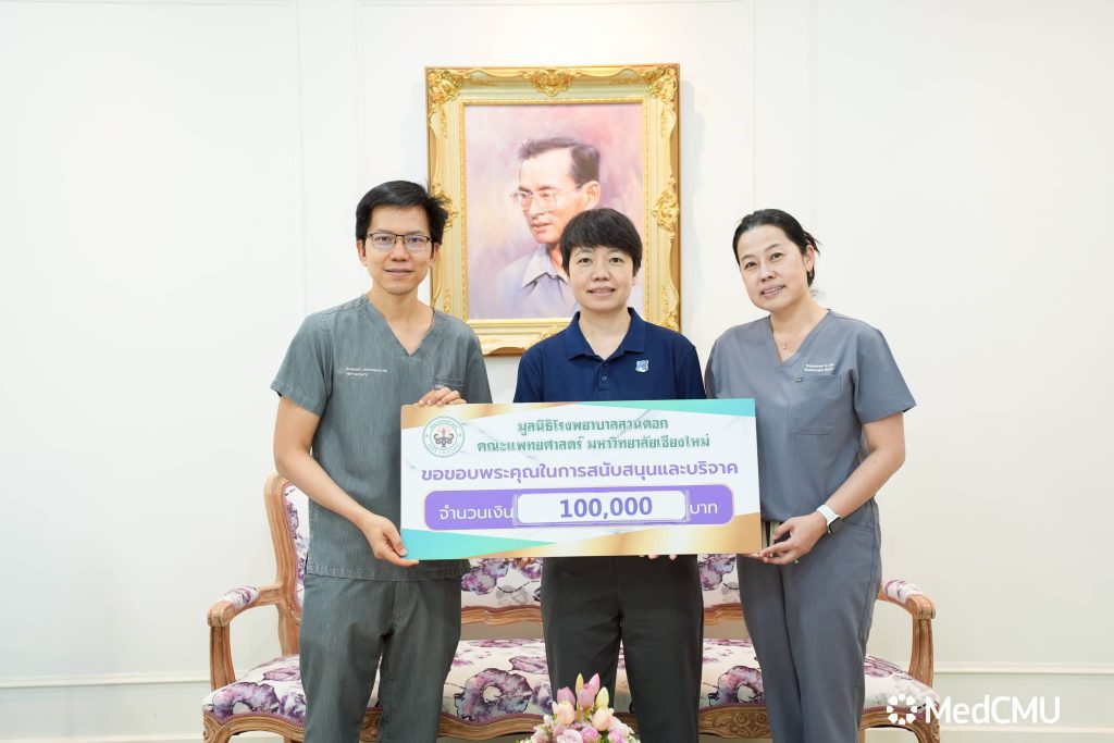 รศ.นพ.สัณหวิชญ์ จันทร์รังสี อาจารย์ประจำหน่วยศัลยศาสตร์ระบบตับ ทางเดินน้ำดี และตับอ่อน ภาควิชาศัลยศาสตร์ คณะแพทยศาสตร์ มช. และคณะ รับมอบเงินบริจาค จำนวน 100,000 บาท