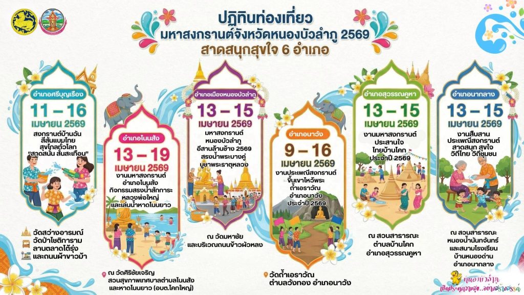 นายสุรศักดิ์ อักษรกุล ผู้ว่าราชการจังหวัดหนองบัวลำภู แจ้งข่าวเตือนภัยช่วงเทศกาลสงกรานต์ปี 2569 ตรงกับวันที่ 12-15 เมษายน 2569โดยมีวันหยุดยาวต่อเนื่อง 5 วัน (12-16 เมษายน 69) ไฮไลท์สำคัญ คือวันมหาสงกรานต์ ตรงกับวันอังคารที่ 14 เมษายน 69 นางสงกรานต์ นามว่า “นางรากษสเทวี” มีการจัดงานฉลองทั่วไทย และช่วงนี้ประชาชนชาวไทยเดินทางกลับภูมิลำเนา หลายภาคส่วนมีการเปิดจุด ตั้งด่านเฝ้าระวัง รณรงค์การขับขี่ในถนนสาธารณะทุกเส้นทางขอให้พี่น้องประชาชนที่เดินทางเข้า-ออกจังหวัดหนองบัวลำภู ให้ระมัดระวังในการขับขี่ เมาอย่าขับจะเป็นการช่วยลดอุบัติเหตุ ขอให้ช่วงนี้เป็นช่วงแห่งการเดินทางเพื่อความปลอดภัยในชีวิตและทรัพย์สินทุกๆคน