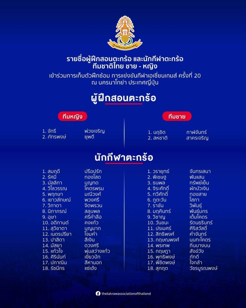 สมาคมตะกร้อแห่งประเทศไทย ประกาศรายชื่อนักกีฬาและโค้ชสู้ศึกเอเชี่ยนเกมส์ ครั้งที่ 20 ญี่ปุ่น ตั้งเป้ากู้ศักดิ์ศรี ทวงเหรียญทองกลับมา