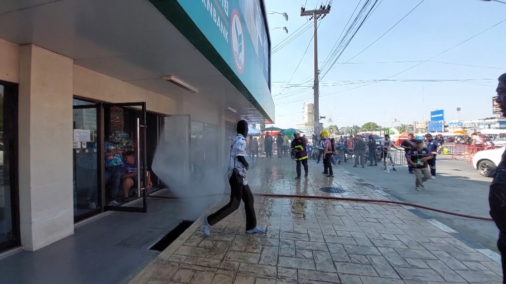 หลังจากที่ทางเจ้าหน้าที่เดินทางมาถึงพบว่า นางทัศนี เนียมทรัพย์ ผู้จัดการธนาคารฯเดินทางมาถึงพอดี โดยพบว่าภายในธนาคารมีกลุ่มควันจนมองไม่เห็นภายในชั้นล่างของธนาคาร เมื่อเจ้าหน้าที่เดินทางเข้าไปได้ใช้เครื่องดูดควันออกมาจากภายในธนาคารและค้นหาจุดที่เกิดกลุ่มควันดังกล่าวและใช้น้ำดับเพลิงที่ลุกไหม้ภายในห้อง ขณะที่ด้านนอกพบว่ามีชาวบ้านที่มาร่วมงานประเพณีสงกรานต์ทราบข่าวเดินทางมามุงดูกันเป็นจำนวนมาก ทางเจ้าหน้าที่ได้ใช้เวลาประมาณ 30 นาทีก็สามารถดูดควันและควบคุมสถานการณ์ไว้ได้ จากการตรวจสอบในเบื้องต้นพบว่าเครื่องเซิร์ฟเวอร์ได้รับความเสียหาย สำหรับสาเหตุที่เกิดเพลิงลุกไหม้และค่าเสียหายที่ทำให้มีกลุ่มควันในครั้งนี้อยู่ระหว่างการตรวจสอบ
