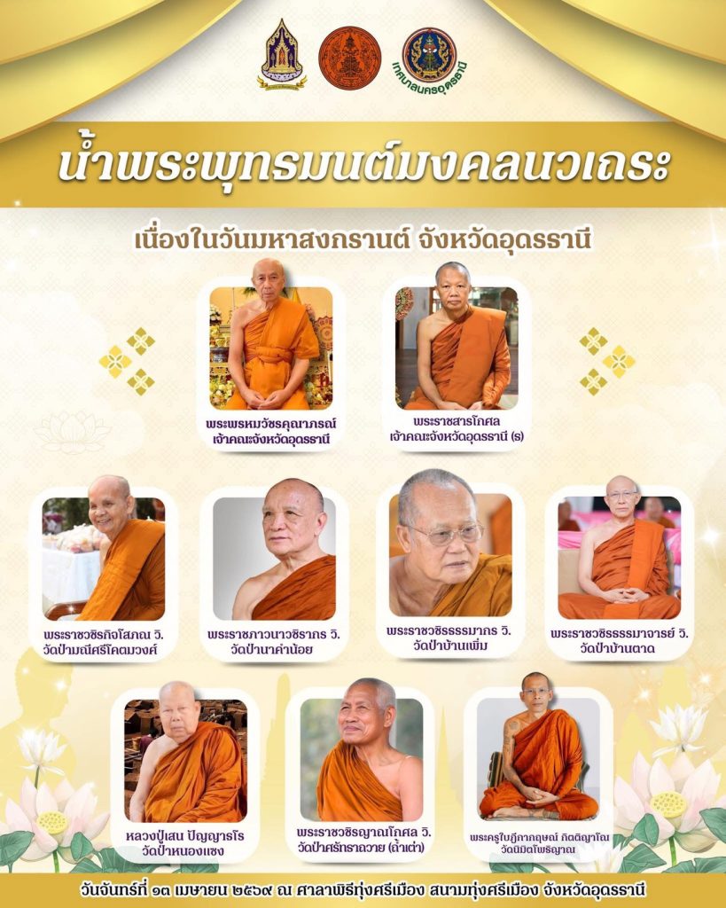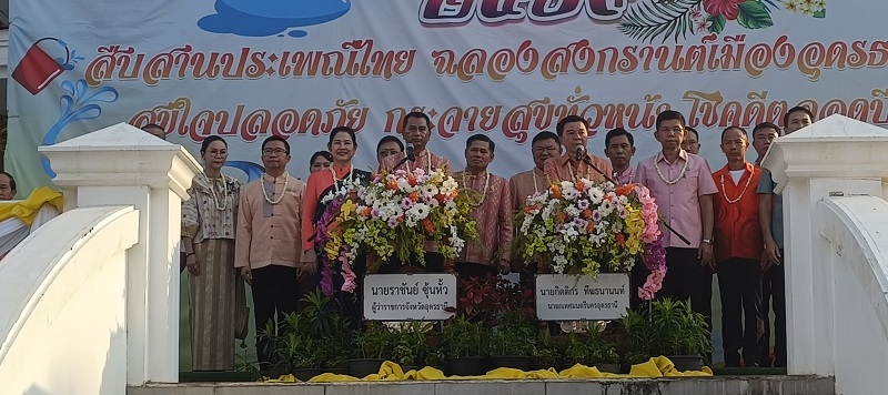 เมื่อเวลา 07.00 น.วันที่ 13 เมษายน 2569 ที่ศาลาพิธีทุ่งศรีเมือง สนามทุ่งศรีเมือง เขตเทศบาลนครอุดรธานี นายราชันย์ ซุ้นหั้ว ผวจ.อุดรธานี เป็นประธานในพิธี ทำบุญตักบาตรในงานประเพณีวันสงกรานต์ ประจำปี 2569 ซึ่งจัดโดยเทศบาลนครอุดรธานีมีนายกิตติกร ทีฆธนานนท์ นายกเทศมนตรีนครอุดรธานีประธานจัดงาน มีพระสงฆ์จากวัดต่าง ๆ ในเขตเทศบาลนครอุดรธานี จำนวน 133 รูป และโดยมี นายณัฐพงศ์ คำวงศ์ปิน, นายพิสิษฐ์ชัย อภัยปิยกุล, นายณฐพล วิถี และ นายจักรพันธ์ จันทรภูมิ รอง ผวจ.อุดรธานี นางนงลักษณ์ ซุ้นหั้ว นายกเหล่ากาชาดจังหวัดอุดรธานี นางรวงทอง พลธิราช วัฒนธรรมจังหวัดอุดรธานี และฝ่ายตุลาการ ทหาร ตำรวจ พลเรือน หัวหน้าส่วนราชการ,รัฐวิสาหกิจ นายอำเภอ ข้าราชการ เจ้าหน้าที่ แขกผู้มีเกียรติ พ่อค้าประชาชน เข้าร่วมพิธีจำนวนมาก