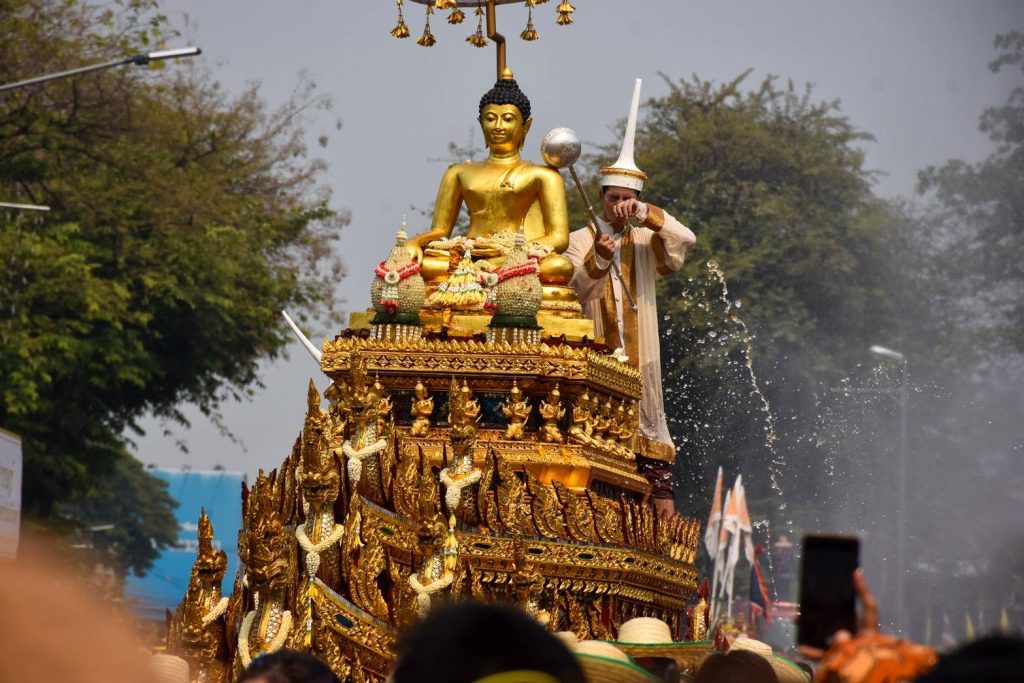 โดยเมื่อช่วงเช้าที่ผ่านมา ได้มีการอัญเชิญพระพุทธสิหิงค์ออกจากพระวิหารลายคำ วัดพระสิงห์วรมหาวิหาร ขึ้นสู่รถบุษบกศรีเชียงใหม่ แล้วเคลื่อนขบวนมาตั้งรอไว้ที่บริเวณแยกสันป่าข่อยเพื่อประกอบพิธีอาราธนา จากนั้นในช่วงบ่าย นายรัฐพล นราดิศร ผู้ว่าราชการจังหวัดเชียงใหม่ พร้อมด้วย นางวิยะดา นราดิศร นายกเหล่ากาชาดจังหวัดเชียงใหม่ นายบุญลือ ธรรมธรานุรักษ์ รองผู้ว่าราชการจังหวัดเชียงใหม่ กงสุลอินเดีย นายกเทศมนตรีนครเชียงใหม่ หัวหน้าส่วนราชการ และประชาชนจากอำเภอต่างๆ ร่วมขบวนอัญเชิญพระพุทธสิหิงค์และพระพุทธรูปสำคัญจากวัดต่างๆ 50 วัด แห่ขบวนออกจากแยกสันป่าข่อย ผ่านสะพานนวรัฐ เข้าสู่ถนนท่าแพ ผ่านข่วงประตูท่าแพ และไปสิ้นสุดที่วัดพระสิงห์วรมหาวิหาร โดยมีการจัดประดับตกแต่งขบวนแห่ตามแบบล้านนาอย่างสวยงาม