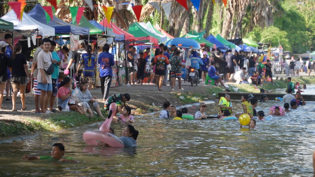 5 วันแล้วกับการละเล่นน้ำ ประเพณีสงกรานต์ ที่จังหวัดนครปฐม บรรยากาศการเล่นน้ำเพื่อคลายความร้อน ก็จะพบว่ามีกลุ่มวัยรุ่นหนุ่มสาวจำนวนมาก ต่างออกมาเล่นน้ำกันที่คลองชลประทานกันหลายอำเภอ และหลายตำบล แต่ที่เป็นไฮไลท์และเป็นจุดแลนด์มาร์ก และฮือฮาที่สุดในปีนี้ก็คือ “คลองตาเล้ง” ม.10 ต.สระพัฒนา อ.กำแพงแสน จ.นครปฐม ที่นายสุวัจชัย เกียรติสกุลทอง นายก อบต.สระพัฒนา ได้พัฒนาคลองให้กลายเป็นที่เล่นน้ำในช่วงเทศกาลสงกรานต์ เป็นระยะทางประมาณ 2 กม. โดยมีการทำความสะอาดคลอง พร้อมติดป้ายประกาศห้าม พกพาอาวุธปืน ห้ามดื่มแอลกอฮอล์ ห้ามสูบบุหรี่/บุหรี่ไฟฟ้า และ ห้ามก่อเหตุทะเลาะวิวาท ปรับคนละ 100,000 บาท พร้อมดำเนินคดี โดยทำการเปิดให้เล่นน้ำกันตั้งแต่วันที่ 10-15 เม.ย.69 มีร้านค้ามาตั้งเรียงรายขายของริมคลองมากกว่า 260 ร้านค้า ซึ่งบรรยากาศก็พบว่าตั้งแต่ช่วงสาย ๆ จะมีกลุ่มวัยรุ่นหนุ่มสาวจากพื้นที่และจากต่างจังหวัด เริ่มทยอยรวมตัวกันมาเล่นน้ำอย่างต่อเนื่อง จนเริ่มหนาแน่นขึ้นเรื่อย ๆ ในช่วงบ่าย และยิ่งเพิ่มจำนวนนับพันจนถึงนับหมื่นคนในช่วงค่ำ โดยมีการเล่นกันยาวนานถึงเที่ยงคืนกันเลยทีเดียว