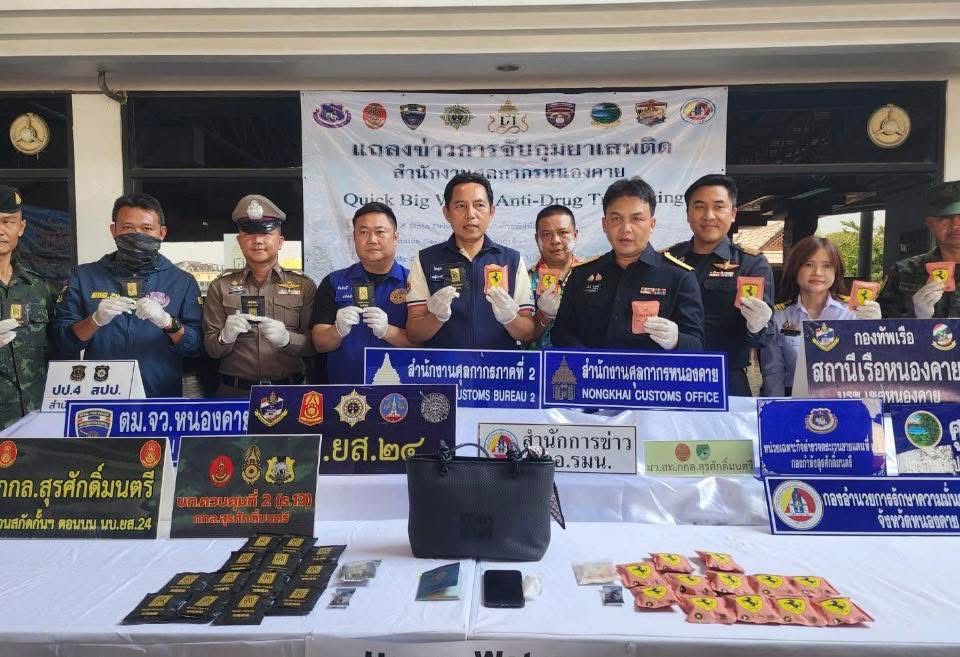 วันที่ 13 เมษายน 2569 ที่ หน้าอาคารผู้โดยสาร (ฝั่งขาเข้า) ด่านพรมแดนหนองคาย สะพานมิตรภาพไทย-ลาว แห่งที่ 1 นายไพฑูรย์ มหาชื่นใจ รองผู้ว่าราชการจังหวัดหนองคาย พร้อมด้วย นายสมจินต์ จิตรสมนึก ผู้อำนวยการส่วนบริการศุลกากร 1 นางสาววริษฐา ศรีคะ หัวหน้าฝ่ายสืบสวนและปราบปราม,นายพัฒนพงศ์ ตันติวัฒนกุลชัย หัวหน้าฝ่ายบริการศุลกากร 1 นายชัยสิทธิ์ คำภาจันทร์ หัวหน้า ศอ.ปส.จ.นค.และหน่วยงานที่เกี่ยวข้องได้แถลงข่าวผลการจับกุมหญิงชาวลาว อายุ 21 ปี พร้อมของกลาง Happy Water จำนวน 40 ซอง น้ำหนัก 3 กก.