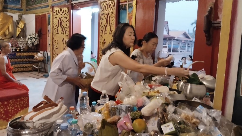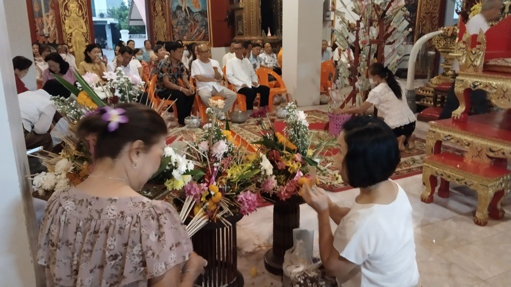 โดยตลอดทั้งวัน ประชาชนพากันนำทรายเข้าสู่วัดเพื่อร่วมกันก่อเป็นเจดีย์ทรายขนาดต่างๆ บริเวณลานหน้าวัดท่าล้อ พร้อมทั้งมีการประดับตกแต่งด้วย “ตุงไส้หมู” และ “ตุงไชย” ที่มีสีสันสวยงาม รวมถึงการปักดอกไม้และธูปเทียน เพื่อถวายเป็นพุทธบูชาตามความเชื่อโบราณที่ว่า การขนทรายเข้าวัดเป็นการนำทรายมาทดแทนส่วนที่ติดเท้าออกไปจากเขตวัดตลอดทั้งปี และเพื่อความเป็นสิริมงคลแก่ตนเองและครอบครัวในช่วงเริ่มต้นปีใหม่ไทย