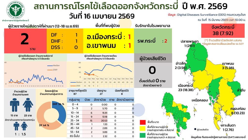 ประชุมวิชาการป้องกันควบคุมการแพร่ระบาดโรคไข้เลือดออกแก่ภาคีเครือข่าย 3 พันคนมีความรู้ความเข้าใจวิธีการป้องกันและมอบโล่ดีเด่นงานวิจัยนวัตกรรมสาธารณสุขประจำปี เมื่อวันที่ 18 เมษายน 2569 เวลา 10.30 นาฬิกา ที่ห้องประชุมกิ่งจันโรงเรียนองค์การบริหารส่วนจังหวัดกระบี่ ถนนท่าเรือ หมู่ที่ 7 บ้านคลองหิน ตำบลไสไทย อำเภอเมืองกระบี่ จังหวัดกระบี่ นายอังกูร ศีลาเทวากูล ผู้ว่าราชการจังหวัดกระบี่ เป็นประธานเปิดการประชุมวิชาการและเสวนาภายใต้หัวข้อทิศทางการเฝ้าระวังป้องกันโรคไข้เลือดออก และการบริหารจัดการการเฝ้าระวังป้องกันควบคุมโรคไข้เลือดออกในพื้นที่จังหวัดกระบี่ และแนวทางการเฝ้าระวังป้องกันโรคไข้เลือดออกที่เหมาะสมกับระบบบริการสุขภาพปฐมภูมิ ประจำปี 2569 จัดขึ้นวันที่ 18 – 19 เมษายน 2569 ซึ่งมีหน่วยงานที่เกี่ยวข้อง อาสาสมัครสาธารณสุขประจำหมู่บ้าน จิตอาสาเราทำความดีด้วยหัวใจเพื่อชาติศาสน์กษัตริย์ ภาคีเครือข่าย เจ้าหน้าที่โรงพยาบาลส่งเสริมสุขภาพตำบล เจ้ากู้ชีพกู้ภัยและประชาชนเข้าร่วม จำนวน 3,000 คน โดยมีนายสมศักดิ์ กิตติธรกุล นายกองค์การบริหารส่วนจังหวัดกระบี่ ให้การต้อนรับและกล่าวรายงานว่าองค์การบริหารส่วนจังหวัดกระบี่ ตระหนักและเห็นถึงความจำเป็นอย่างยิ่งที่จะต้องมีส่วนร่วมกับภาคส่วนราชการ องค์กรเอกชน ตลอดจนประชาชนในพื้นที่เพื่อร่วมกันป้องกันและควบคุมโรค รวมถึงร่วมกันพัฒนางานนวัตกรรมที่เกี่ยวข้อง จึงได้จัดกิจกรรมการประชุมวิชาการป้องกันและควบคุมโรคดังกล่าวขึ้น เพื่อพัฒนาศักยภาพให้อาสาสมัคร จิตอาสา ภาคีเครือข่ายสุขภาพ เจ้าหน้าที่สาธารณสุข และประชาชนในจังหวัดกระบี่ มีความรู้ความเข้าใจเกี่ยวกับโรคติดต่อและโรคไม่ติดต่อ วิธีการป้องกันควบคุมโรค และสามารถถ่ายทอดความรู้ ให้แก่สมาชิกในชุมชนได้ เพื่อเฝ้าระวังป้องกันและควบคุมไม่ให้โรคไข้เลือดออกแพร่ระบาด โดยการฉีดพ่นหมอกควันสารเคมีกำจัดยุงตัวแก่ มอบทรายกำจัดลูกน้ำยุง และทำลายแหล่งเพาะพันธ์ลูกน้ำยุงลายในชุมชน พื้นที่จังหวัดกระบี่ และเพื่อสร้างความตระหนักให้ประชาชนในจังหวัดกระบี่ ร่วมกันเฝ้าระวังป้องกันและควบคุมโรคไข้เลือดออก โดยนายอังกูร ศีลาเทวากูล ผู้ว่าราชกาสรจังหวัดกระบี่ กล่าวว่า การประชุมวิชาการป้องกันและควบคุมโรคในวันนี้ เป็นการส่งเสริมการพัฒนานวัตกรรมป้องกันและควบคุมโรค สร้างแกนนำในการเผยแพร่ความรู้รวมถึงแนวทางการปฏิบัติให้แก่ผู้เข้าร่วมกิจกรรมสามารถถ่ายทอดต่อไปยังบุคคลอื่น โดยเป็นอีกแนวทางหนึ่งที่จะเสริมส