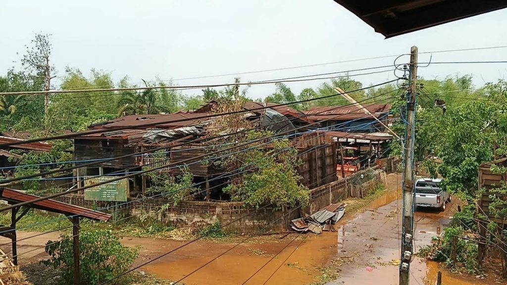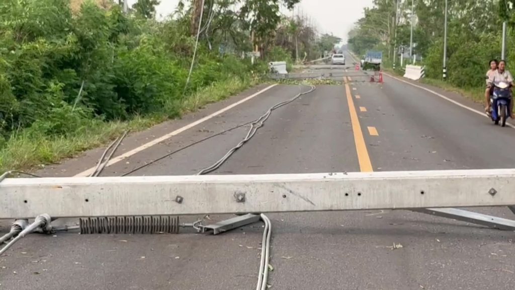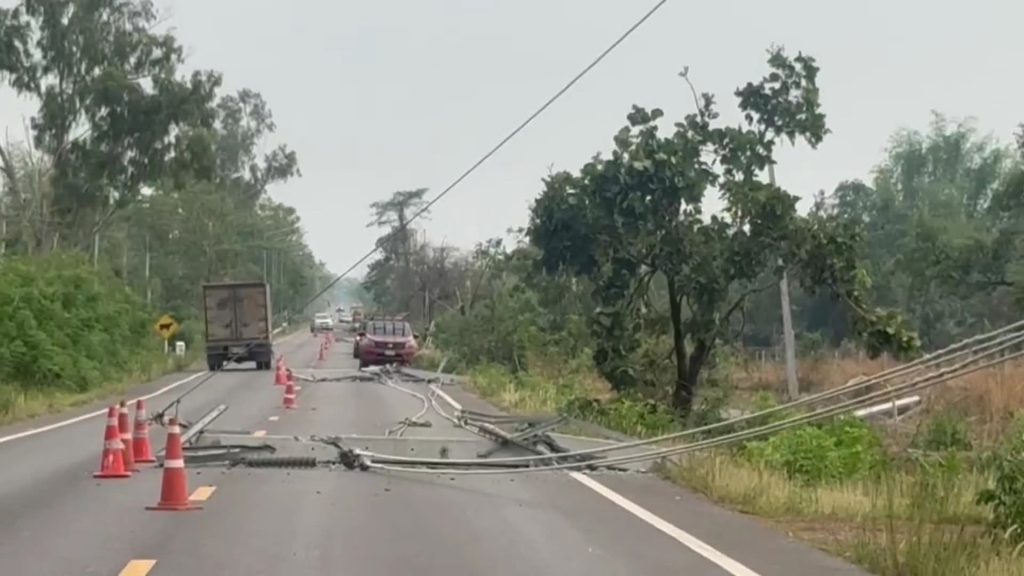 สกลนคร จนท.ไฟฟ้าระดมสรรพกำลังเครื่องมือพร้อมอุปกรณ์ซ่อมหลังงายุพัดโค่นเสาไฟฟ้า 15 ต้น