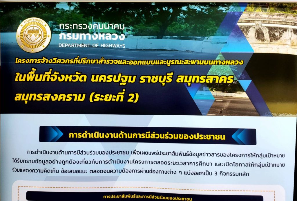 สำนักสำรวจและออกแบบกรมทางหลวง ประชุมสรุปผลการศึกษาโครงการ (สัมมนาครั้งที่ 3)โครงการจ้างวิศวกรที่ปรึกษาโครงการสำรวจและออกแบบบูรณะสะพานบนทางหลวงในพืันที่ 4 จังหวัดจ.นครปฐม จ.ราชบุรี จ.สุมทรสาคร จ.สมุทรสงคราม ระยะที่ 2.ที่ห้องประชุมเขาแก่นจันทร์ ชั้น 3 สหกรณ์ออมทรัพย์ครูราชบุรี จำกัด อ.เมือง จ.ราชบุรี นายสุทธิพงษ์ พุทธจันทรา ปลัดจังหวัดราชบุรี กล่าวต้อนรับ ผู้เข้าร่วมประชุมสรุปผลการศึกษาโครงการ สัมมนาครั้งที่ 3 โดยมี นายชาย ทรัพย์แจ่ม รองผู้อำนวยการแขวงทางหลวงราชบุรี กล่าวถึงโครงการดังกล่าวทั้งนี้สืบเนื่องมาจากสำนักสำรวจและออกแบบกรมทางหลวงได้ว่าจ้างกลุ่มบริษัทที่ปรึกษาซึ่งประกอบด้วยบริษัทอินเด็กซ์ อินเตอร์เนชั่นแนล กรุ๊ป จำกัด(มหาชน) บริษัทสยามเทค กรุ๊ป จำกัดและมหาวิทยาลัยเทคโนโลยีพระจอมเกล้าพระนครเหนือให้ดำเนินงานด้านบริการวิศวกรรมการสำรวจและออกแบบโครงการดังกล่าวไว้แล้วโดยมีทุกภาคส่วนตลอดจนผู้นำชุมชนและประชาชนในพื้นที่ ทั้ง 4 จังหวัดได้แก่ จ.นครปฐม จ.ราชบุรี จ. สมุทรสาคร จ.สมุทรสงคราม จำนวน 150 คนเข้าร่วมประชุมในครั้งนี้เพื่อนำเสนอสรุปโครงการในพื้นที่ประชาชนมีส่วนร่วมพร้อมทั้งรับฟังข้อเสนอแนะเพื่อนำมาปรับปรุงแนวทางการศึกษาโครงการให้มีความเหมาะสมต่อไป.ฐิติวัฒน์ ลิ้มเจริญ /จ.ราชบุรี /รายงาน
