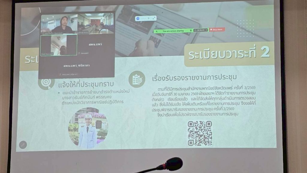 พาณิชย์แพร่ !!! ประชุมประจำเดือน เพื่อเดินหน้าขับเคลื่อนแผนปฏิบัติงานปี 2569 และนโยบายเร่งด่วนของรัฐบาล วันพฤหัสบดีที่ 22 เมษายน 2569 เวลา 15.00 น. นายศุภสัณห์ ศิลป์ชูศรี พาณิชย์จังหวัดแพร่ เป็นประธานการประชุมข้าราชการและเจ้าหน้าที่สำนักงานพาณิชย์จังหวัดแพร่ ครั้งที่ 4/2569 ประจำเดือนเมษายน 2569 ณ ห้องประชุมพญาพล ชั้น 3 สำนักงานพาณิชย์จังหวัดแพร่ โดยมีหัวหน้ากลุ่มงานและเจ้าหน้าที่ในสังกัดเข้าร่วมประชุมทั้งแบบ On-site และผ่านระบบ Online (Zoom) อย่างพร้อมเพรียงกัน การประชุมในครั้งนี้มุ่งเน้นติดตามความคืบหน้าการดำเนินงานตามแผนปฏิบัติราชการ ประจำปีงบประมาณ พ.ศ. 2569 ของทุกกลุ่มงานฯ ในการเดินหน้าขับเคลื่อนแผนปฏิบัติงานฯ พร้อมพัฒนาเศรษฐกิจฐานรากของจังหวัดแพร่ให้เติบโตอย่างยั่งยืนต่อไปและเตรียมการปฏิบัติพันธกิจสำคัญเร่งด่วนของรัฐบาลในลดภาระค่าใช้จ่ายและเยียวยาช่วยเหลือประชาชน ตามโครงการไทยช่วยไทย และธงฟ้าลดค่าครองชีพฯลฯ ในโอกาสนี้ นายศุภสัณห์ ศิลป์ชูศรี พาณิชย์จังหวัดแพร่ ได้แนะนำข้าราชการย้ายมาปฏิบัติงาน ณ สำนักงานพาณิชย์จังหวัดแพร่ จำนวน 1 ราย ได้แก่ นางสาวธันย์ภัคนันท์ พรรณคง นักวิชาการพาณิชย์ปฏิบัติการ กลุ่มยุทธศาสตร์และแผนงานด้วย.ทีมข่าว/จ.แพร่