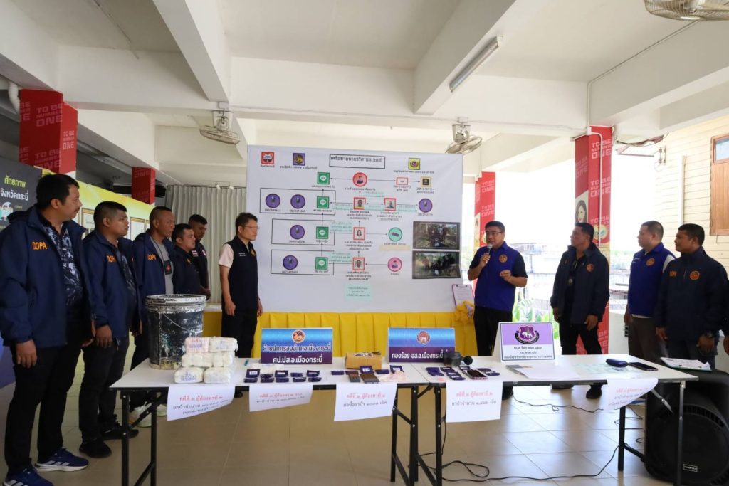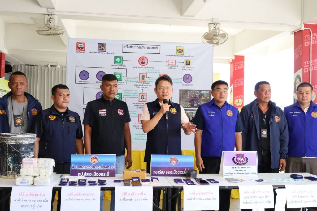 ชุดปราบปรามยาเสพติดเมืองกระบี่โชว์ผลงานรวบ 4 ผู้ต้องหาเครือข่ายค้ายาบ้ายึดได้ 38,726 เม็ดพบ 2 คนเคยติดคุกหวนกลับมาอยู่ในวงจรซ้ำซากเมื่อวันที่ 25 เมษายน 2569 เวลา 10:00 นาฬิกา ที่ห้องโถงที่ว่าการอำเภอเมืองกระบี่ ถนนอุตรกิจ เขตเทศบาลเมืองกระบี่ ตำบลปากน้ำ อำเภอเมืองกระบี่ จังหวัดกระบี่ นายอังกูร ศีลาเทวากูล ผู้ว่าราชการจังหวัดกระบี่ พร้อมด้วยนายปรีชา สอิ้งทอง นายอำเภอเมืองกระบี่ ร่วมแถลงข่าวผลการกวาดล้างและปราบปรามขบวนการค้ายาเสพติด ของชุดปฏิบัติการพิเศษที่ว่าการอำเภอเมืองกระบี่ ร่วมกับตำรวจตระเวนชายแดนที่ 426 จังหวัดกระบี่ ซึ่งนำไปสู่การจับกุมผู้ต้องหาได้รวม 3 คดีรวม จำนวน 4 คน พร้อมด้วยของกลางยาบ้าและยาไอซ์จำนวนมาก โดยปฏิบัติการเริ่มจากวันที่ 21 เมษายน 2569 เจ้าหน้าที่เข้าจับกุมตัว นางสาวศศิธร หรือแจง คำโปร่ง อายุ 45 ปี ภายในบ้านเช่าแห่งหนึ่งในพื้นที่หมู่ที่ 5 บ้านทุ่ง ตำบลอ่าวนาง อำเภอเมืองกระบี่ จังหวัดกระบี่ พร้อมด้วยของกลางยาบ้า จำนวน 55 เม็ด และยาไอซ์น้ำหนัก 13.33 กรัม จากการตรวจสอบประวัติพบว่า เคยต้องโทษจำคุกในคดียาเสพติดมาแล้ว 3 ครั้ง แต่หลังจากพ้นโทษออกจากคุกยังหวนกลับมากระทำผิดซ้ำซาก.จากนั้นเจ้าหน้าที่ได้ทำการสืบสวนขยายผลนำไปสู่การจับกุม นางสาวตรีทิพย์พิภา หรือ หญิง สังข์เกื้อ ได้ที่บริเวณหน้าปั๊มน้ำมันโค้งปลาลัง หมู่ที่ 2 บ้านหนองกก ตำบลไสไทย อำเภอเมืองกระบี่ จังหวัดกระบี่ พร้อมด้วยของกลางยาบ้า จำนวน 200 เม็ด และยาไอซ์น้ำหนัก 9.66 กรัม เมื่อวันที่ 23 เมษายน 2569 จากการตรวจสอบประวัติยังพบว่าบุคคลดังกล่าวเคยต้องโทษจำคุกในคดียาเสพติดมาแล้ว 2 ครั้ง ศาลชั้นต้นพิพากษาจำคุก 90 ปี ติดจริงเหลือ 12 ปี พอพ้นโทษหวนกลับมาก่อเหตุซ้ำอีก เจ้าหน้าที่จึงได้สืบสวนทำการขยายผลสามารถติดตามจับกุมตัวขบวนการค้ายาเสพติดได้เพิ่มอีก จำนวน 2 คนได้แก่ นายย่าริต อุไรกิจ และนายวริศ ชลเขตต์ ที่บริเวณริมถนนสายต้นทวย – ตลิ่งชัน ท้องที่ตำบลคลองเขม้า อำเภอเหนือคลอง จังหวัดกระบี่ พร้อมด้วยของกลางยาบ้า จำนวน 38,471 เม็ด ซึ่งถือเป็นล็อตใหญ่ของเครือข่ายดังกล่าว ผลการปฏิบัติการในครั้งนี้สามารถจับกุมผู้ต้องหาได้รวมจำนวน 4 คน ยึดของกลางยาบ้าได้ทั้งสิ้น 38,726 เม็ด และยาไอซ์ น้ำหนักรวม 22.99 กรัม .โดยนายอังกูร ศีลาเทวากูล ผู้ว่าราชการจังหวัดกระบี่ กล่าว่า จังหวัดกระบี่เดินหน้า ยุทธการอินทรี 154 แจ้งจับปรับอย่างจริงจัง โดยบูรณาการความร่วมมือจากทุกภาคส่วน ทั้งฝ่ายปกครอง ตำรวจ และหน่วยงานที่เกี่ยวข้อง เดินหน้าปราบปรามเครือข่ายขบวนการค้ายาเสพติดอย่า