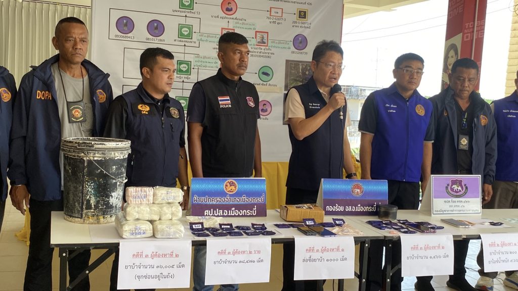 ชุดปราบปรามยาเสพติดเมืองกระบี่โชว์ผลงานรวบ 4 ผู้ต้องหาเครือข่ายค้ายาบ้ายึดได้ 38,726 เม็ด