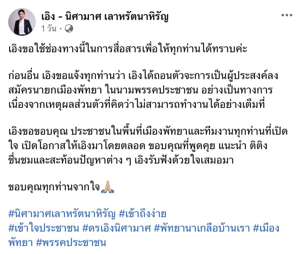 ปชน.ส่ง ‘อิทธิวัฒน์ วัฒนศาสตร์สาธร’ น้องชาย ’นิรันดร์‘ อดีตนายกเมืองพัทยา แทน ’เอิง นิศามาส‘ หลังจาก น.ส.นิศามาศ เลาหรัตนาหิรัญ แคนดิเดตนายกเมืองพัทยา จากพรรคประชาชน ได้โพสต์ข้อความลงเฟซบุ๊ก ดร.เอิง – นิศามาศ เลาหรัตนาหิรัญ ถอนตัวจากการลงสมัครรับเลือกตั้ง โดยระบุว่า เอิงขอใช้ช่องทางนี้ในการสื่อสารเพื่อให้ทุกท่านได้ทราบค่ะก่อนอื่น เอิงขอแจ้งทุกท่านว่า เอิงได้ถอนตัวจะการเป็นผู้ประสงค์ลงสมัครนายกเมืองพัทยา ในนามพรรคประชาชน อย่างเป็นทางการ เนื่องจากเหตุผลส่วนตัวที่คิดว่าไม่สามารถทำงานได้อย่างเต็มที่เอิงขอขอบคุณ ประชาชนในพื้นที่เมืองพัทยาและทีมงานทุกท่านที่เปิดใจ เปิดโอกาสให้เอิงมาโดยตลอด ขอบคุณที่พูดคุย แนะนำ ติติง ชื่นชมและสะท้อนปัญหาต่าง ๆ เอิงรับฟังด้วยใจเสมอมาขอบคุณทุกท่านจากใจมีรายงานว่า พรรคประชาชนได้ส่งรายชื่อแคนดิเดตนายกเมืองพัทยาคนใหม่ คือ นายอิทธิวัฒน์ วัฒนศาสตร์สาธร อดีตสมาชิกสภาเมืองพัทยา ซึ่งมีศักดิ์เป็นน้องชายของนายนิรันดร์ วัฒนศาสตร์สาธร อดีตนายกเมืองพัทยา ลงแทน น.ส่ง.นิศามาศ ที่แสดงเจตจำนงค์ถอนตัวออกไป อย่างไรก็ตามจากกระแสดังกล่าวทำให้ประชาชนในเมืองพัทยาที่ติดตามการเมืองท้องถิ่นต่างวิพากษ์วิจารณ์กันไปต่างๆ ถึงความเข้มข้นของการเลือกตั้งเมืองพัทยา ซึ่งจะมีการเปิดรับสมัครรับเลือกตั้งสมาชิกสภาเมืองพัทยา และนายกเมืองพัทยา ระหว่างวันที่ 28 พฤษภาคม ถึง 1 มิถุนายน 2569 และจะมีการเลือกตั้ง ในวันอาทิตย์ที่ 28 มิถุนายน 2559 เวลา 08.00 ถึง 17.00 น.