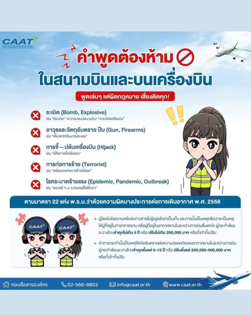 แตกตื่นทั้งสนามบินหนุ่มอ้างพลั้งปากพูดระวังระเบิดทำให้เที่ยวบินยุติด่วนอีโอดีตรวจเข้มกว่า 5 ชั่วโมงไม่พบสิ่งอันตรายการบินพลเรือนย้ำเป็นพฤติกรรมต้องห้ามโทษหนักติดคุกและปรับเมื่อวันที่ 26 เมษายน 2569 เวลา 16.30 นาฬิกา ได้เกิดเหตุวุ่นวายบนเครื่องบินของสายการบินแอร์เอเชีย ที่จอดรอรับผู้โดยสารบนลานบินในท่าอากาศยานนานาชาติจังหวัดกระบี่ หมู่ที่ 5 บ้านไสโป๊ะเหนือ ตำบลเหนือคลอง อำเภอเหนือคลอง จังหวัดกระบี่ เพื่อมุ่งหน้าสู่สนามบินดอนเมือง กรถุงเทพมหานคร ได้มีผู้โดยสารชายอายุ 46 ปี และหญิงอายุ 43 ปี ซึ่งเป็นสามีภรรยา พลั้งปากพูดคำว่าระวังระเบิด ขณะที่พนักงานสายการบินแอร์เอเชียกำลังช่วยจัดเก็บสัมภาระบนเครื่อง หลังจากที่พนักงานคนดังกล่าวได้ยินคำพูดนั้น จึงได้แจ้งกัปตันทันทีและทำการยุติการบิน โดยใช้มาตรการความปลอดภัยขั้นสูงสุดสั่งอพยพผู้โดยสารทั้งหมดลงจากเครื่องบินลำดังกล่าว พร้อมประสานชุดเก็บกู้วัตถุระเบิดหรืออีโอดี กองกำกับการตำรวจภูธรจังหวัดกระบี่ เข้าทำการตรวจสอบบนเครื่องบินอย่างละเอียด ด้วยการตรวจสัมภาระทุกชิ้น รวมถึงกระเป๋าต้องสงสัย ใช้เวลานานกว่า 5 ชั่วโมง ท่ามกลางความตึงเครียดของผู้โดยสารทั้งลำ ก่อนยืนยันไม่พบวัตถุอันตรายหรือสิ่งผิดกฎหมายแต่อย่างใดจากการสอบสวนของเจ้าหน้าที่ ผู้ก่อเหตุให้การว่าได้พูดลอยๆโดยไม่มีเจตนา อย่างไรก็ตามการกระทำดังกล่าวเข้าข่ายแจ้งข้อความอันเป็นเท็จ สร้างความตื่นตระหนกและกระทบต่อความปลอดภัยด้านการบินด้านของพลตำรวจตรี สุขเกษม นครวิลัย ผู้บังคับการตำรวจภูธรจังหวัดกระบี่ เปิดเผยว่าเจ้าหน้าที่ได้ดำเนินคดีกับผู้โดยสารทั้งสองคนแล้ว ส่วนสายการบินดังกล่าวภายหลังจากตรวจสอบอย่างละเอียดแล้วไม่พบสิ่งอันตรายจึงได้ทำการบินตามปกติ พร้อมย้ำเตือนว่าการพูดหรือสื่อสารเกี่ยวกับวัตถุระเบิดในพื้นที่การบิน แม้เป็นการล้อเล่นหรือพลั้งปากถือว่าเป็นความผิดร้ายแรงมีโทษตามกฎหมาย และก่อให้เกิดความเสียหายทั้งต่อสายการบิน ผู้โดยสารรายคนอื่นๆ รวมถึงภาพลักษณ์ด้านความปลอดภัยของประเทศ จึงไม่ควรเลียนแบบพฤติกรรมดังกล่าวโดยเด็ดขาดทั้งนี้สำนักงานการบินพลเรือนแห่งประเทศไทย ได้แจ้งเตือนประชาชนห้ามพูดล้อเล่นหรือกล่าวถึงคำเหล่านี้เด็ดขาด แม้พูดเล่นก็ผิดกฎหมายเสี่ยงติดคุกและเสียค่าปรับสูงมาก ซึ่งคำห้ามพูดในเขตสนามบินและบนเครื่องได้แก่ ระเบิด ปืน หรืออาวุธอันตราย การจี้เครื่องบิน ผู้ก่อการร้าย โรคระบาดร้ายแรง แม้ไม่มีเจตนาก็เข้าข่ายความผิดพระราช