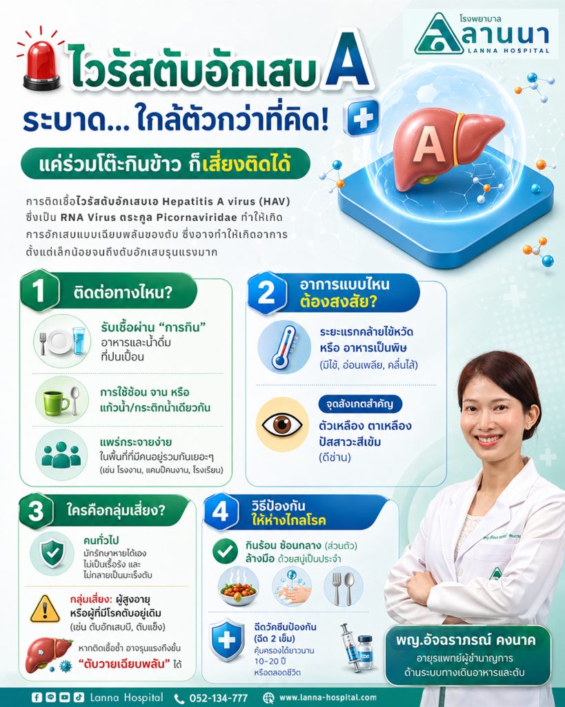 (okay)โรงพยาบาลลานนา เตือนรับมือ “ไวรัสตับอักเสบ เอ” ระบาดหนัก แค่ร่วมโต๊ะอาหารก็เสี่ยงติดเชื้อ พร้อมแนะวิธีป้องกันและสังเกตอาการ.จากสถานการณ์ข่าวการแพร่ระบาดของเชื้อไวรัสตับอักเสบ เอ (Hepatitis A) ในพื้นที่โรงงานอุตสาหกรรมแห่งหนึ่งในจังหวัดชลบุรี ซึ่งพบผู้ติดเชื้อพุ่งสูงกว่า 50 ราย จนสร้างความตื่นตระหนกให้กับประชาชนนั้น เหตุการณ์นี้ถือเป็นสัญญาณเตือนสำคัญที่สะท้อนให้เห็นว่า “โรคไวรัสตับอักเสบ เอ” เป็นภัยเงียบที่ใกล้ตัวกว่าที่คิด และสามารถแพร่กระจายได้อย่างรวดเร็วในพื้นที่ที่มีผู้คนอยู่รวมกันเป็นจำนวนมาก วันนี้ทาง พญ.อัจฉราภรณ์ คงนาค แพทย์ผู้เชี่ยวชาญด้านระบบทางเดินอาหารและตับ โรงพยาบาลลานนา จึงได้ออกมารณรงค์ให้ความรู้ เพื่อสร้างความตระหนักและแนวทางป้องกันที่ถูกต้องให้กับประชาชน(depressed) ทำความรู้จัก “ไวรัสตับอักเสบ เอ” (Hepatitis A)โรคไวรัสตับอักเสบ เอ เกิดจากการติดเชื้อไวรัส Hepatitis A virus (HAV) ซึ่งเป็น RNA Virus ในตระกูล Picornaviridae ทำให้เกิดการอักเสบแบบเฉียบพลันของตับ แม้คนไทยส่วนใหญ่จะคุ้นเคยกับไวรัสตับอักเสบบี (B) หรือซี (C) ที่มีแนวโน้มพัฒนาเป็นโรคตับแข็งและมะเร็งตับมากกว่า แต่ไวรัสตับอักเสบเอก็มีความอันตรายในรูปแบบของตัวเอง โดยโรคนี้เป็นการติดเชื้อแบบ “เฉียบพลัน” ส่วนใหญ่มักรักษาหายขาดได้เอง ไม่กลายเป็นโรคตับอักเสบเรื้อรัง และไม่พัฒนาไปสู่มะเร็งตับ(laugh)ติดต่อง่าย แค่ “กินร่วมกัน”ความน่ากลัวของไวรัสชนิดนี้คือ “การติดต่อที่ง่ายดาย” เชื้อไวรัสจะถูกขับออกมาทางอุจจาระของผู้ป่วย และเข้าสู่ร่างกายผู้อื่นผ่านทางเดินอาหาร (Fecal-oral route) โดยมีช่องทางการติดต่อหลัก ได้แก่:(check mark) การรับประทานอาหาร หรือดื่มน้ำที่ปนเปื้อนเชื้อไวรัส(check mark) การใช้ภาชนะร่วมกัน เช่น ช้อน จาน แก้วน้ำ หรือกระติกน้ำแข็ง(check mark) การสัมผัสใกล้ชิดกับผู้ติดเชื้อ หรือเข้าห้องน้ำแล้วล้างมือไม่สะอาดก่อนหยิบจับอาหาร(check mark) แพร่กระจายได้รวดเร็วในพื้นที่ที่มีคนอยู่ร่วมกันหนาแน่น เช่น โรงอาหาร โรงงาน โรงเรียน หรือแคมป์คนงาน(sick Moon)สัญญาณเตือนภัย อาการแบบไหนต้องระวัง?หลังจากรับเชื้อ ผู้ป่วยจะมีระยะฟักตัวประมาณ 2-4 สัปดาห์ ก่อนจะเริ่มแสดงอาการ โดยแบ่งเป็น 2 ระยะสำคัญ:(one)ระยะแรก (คล้ายไข้หวัดหรืออาหารเป็นพิษ): มีไข้ต่ำๆ ถึงสูง อ่อนเพลีย เบื่ออาหาร คลื่นไส้ อาเจียน ปวดเมื่อยตามตัว หรือมีอาการปวดท้องขวาบน (บริเวณตับ)(fire)ระยะตับอักเสบ (จุดสังเกตสำคัญ): ผู้ป่วยจะเริ่มมีอาการ “ดีซ่าน” คือ ตัวเหลือง ตาขาวเปลี่ยนเป็นสีเหลือง และปัสสาวะมีสีเข้มคล้ายน้ำชา ซึ่งเป็นสัญญาณชัดเจนว่