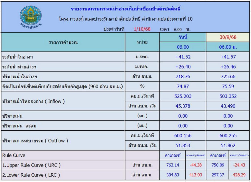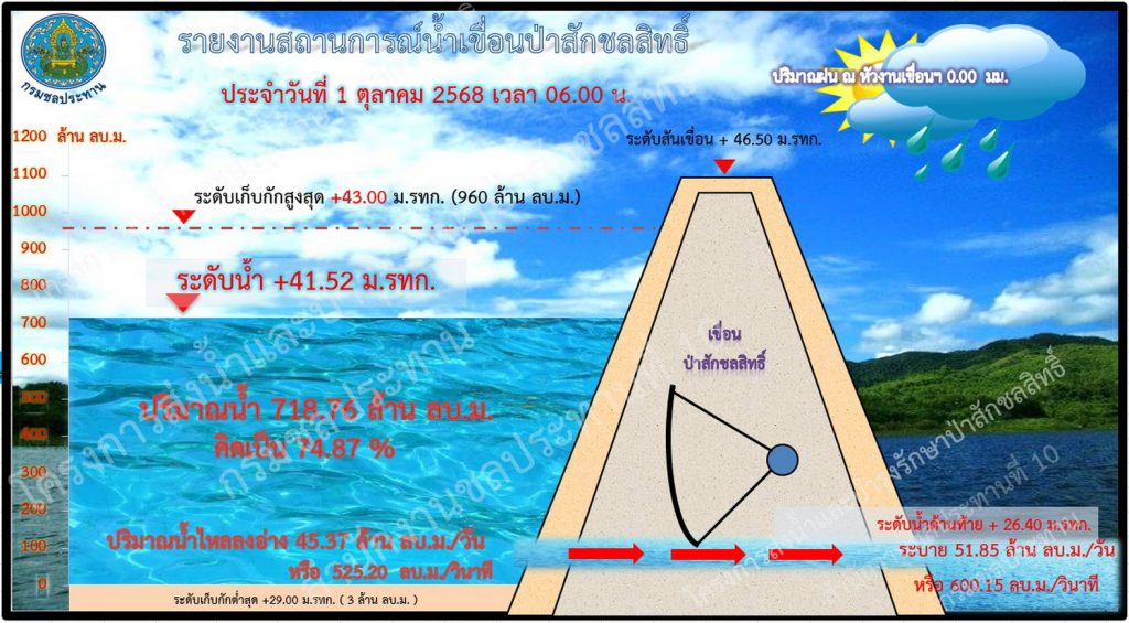 ซึ่งในวันนี้เขื่อนป่าสักชลสิทธิ์เก็บกักน้ำอยู่ที่ 718.76 ล้านลูกบาศก์เมตร หรือคิดเป็นร้อยละ 74.87 จากความจุเก็บกักสูงสุดที่ 960 ล้านลูกบาศก์เมตร โดยมีปริมาณน้ำไหลลงในตัวเขื่อนวันละ 45.378 ล้านลูกบาศก์เมตรต่อวัน และระบายลงสู่ท้ายเขื่อนป่าสักชลสิทธิ์วันละ 51.853 ล้านลูกบาศก์เมตร หรือ 600.156 ลูกบาศก์เมตรต่อวินาที จึงขอให้ประชาชนได้สบายใจได้ว่าเขื่อนป่าสักชลสิทธิ์ยังสามารถรับน้ำได้อีกมากและจะยังคงพร่องน้ำที่จะเตรียมรับน้ำเหนือในปริมาณเท่าเดิมจนถึงวันที่ 12 ตุลาคมนี้ตามแผนที่ทางกรมชลประทานได้วางไว้ ซึ่งจะมีการระบายน้ำลงสู่ท้ายเขื่อนมากกว่าปริมาณน้ำที่ไหลลงสู่ในตัวเขื่อนป่าสักชลสิทธิ์ในการเตรียมพื้นที่ไว้รองรับน้ำ พร้อมกันนี้ก็ขอให้ประชาชนได้ตืดตามสถานการณ์น้ำฝนที่จะตกลงมาในช่วงนี้อย่างใกล้ชิด