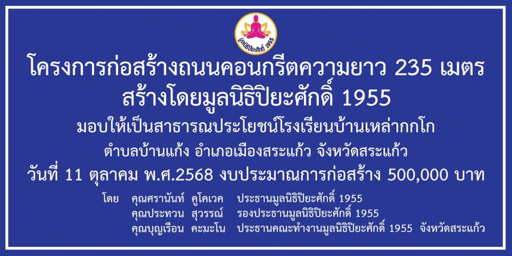 โครงการดังกล่าวได้รับการสนับสนุนงบประมาณจาก มูลนิธิปิยะศักดิ์ 1955 โดยมีคณะทำงานจิตอาสาจังหวัดสระแก้ว เป็นผู้ดำเนินการก่อสร้างถนนคอนกรีต ด้วยแรงกายแรงใจร่วมกัน เพื่ออำนวยความสะดวกแก่เด็กนักเรียน ผู้ปกครอง และชุมชน ในการเดินทางมาโรงเรียนได้อย่างปลอดภัยและสะดวกยิ่งขึ้น