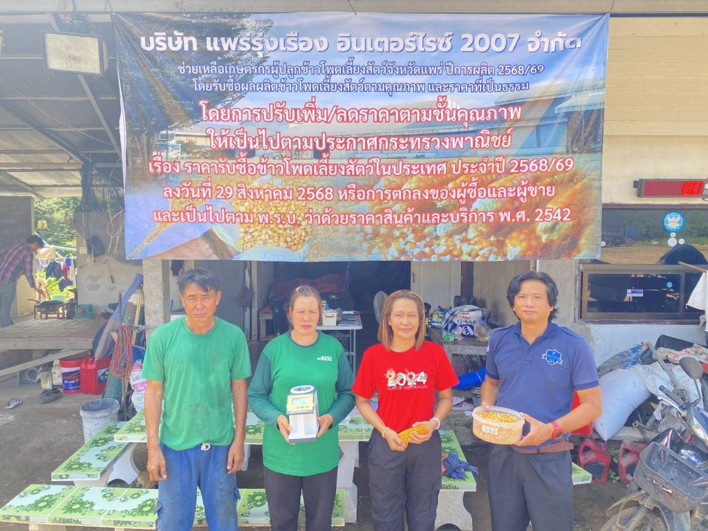 วันพฤหัสบดีที่ 2 ตุลาคม 2568 เวลา 13.30 น. นายศุภสัณห์ ศิลป์ชูศรี พาณิชย์จังหวัดแพร่ เปิดเผยว่า ตามที่สำนักงานฯ ได้รับแจ้งเรื่องร้องเรียนของลานรับซื้อข้าวโพดเลี้ยงสัตว์ในพื้นที่อำเภอสอง จังหวัดแพร่ เนื่องจากรับซื้อข้าวโพดเลี้ยงสัตว์ของเกษตรกรในพื้นที่ในราคาต่ำอาจไม่เป็นไปตามประกาศของกระทราวงพาณิชย์ เรื่อง ราคารับซื้อข้าวโพดเลี้ยงสัตว์ในประเทศ ประจำปี 2568/68 ลงวันที่ 29 สิงหาคม 2568 ที่ผ่านมานั้น