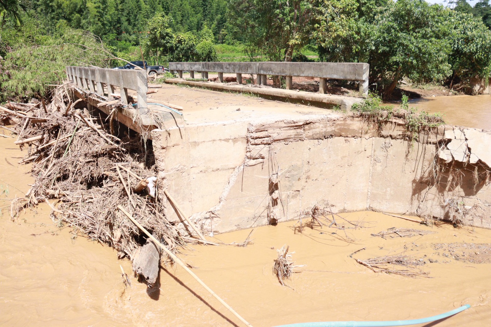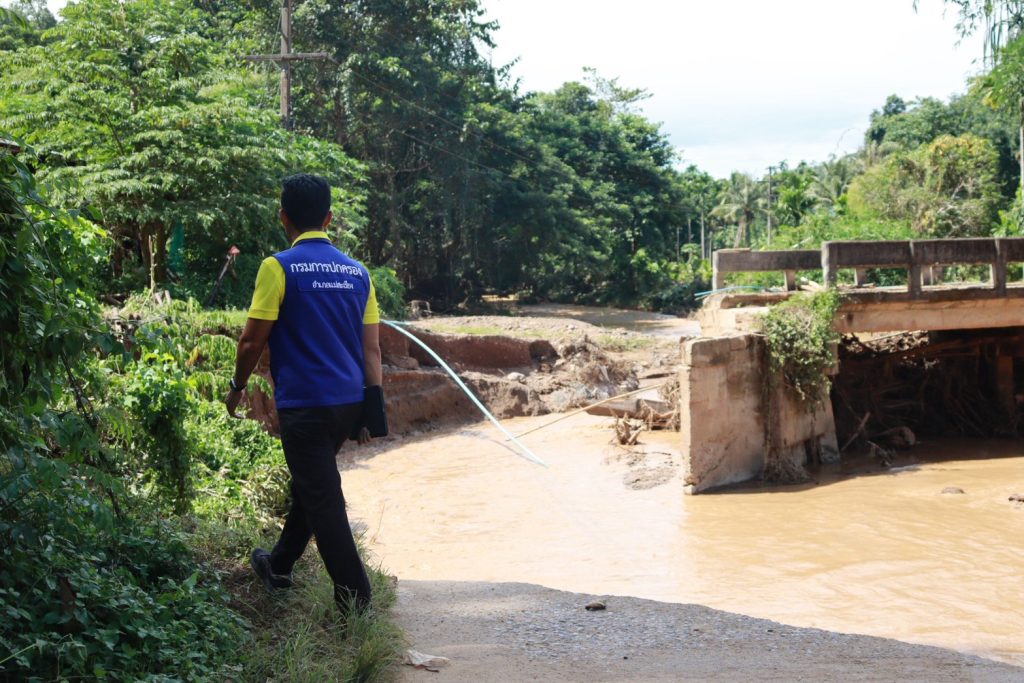 น้ำป่าที่ไหลบ่าเข้ามามีกำลังแรง กัดเซาะคอสะพานทางเข้าหย่อมบ้านจนขาด ทำให้เส้นทางสัญจรถูกตัดขาดไม่สามารถใช้งานได้ อีกทั้งกระแสน้ำยังพัดพาเอาดินโคลน ก้อนหิน และเศษซากกิ่งไม้จำนวนมากมากีดขวางทางน้ำ ส่งผลกระทบต่อการใช้ชีวิตประจำวันของประชาชนในพื้นที่อย่างหนัก หลายครอบครัวไม่สามารถเดินทางเข้าออกหมู่บ้านได้ สร้างความเดือดร้อนให้กับราษฎรจำนวนมาก