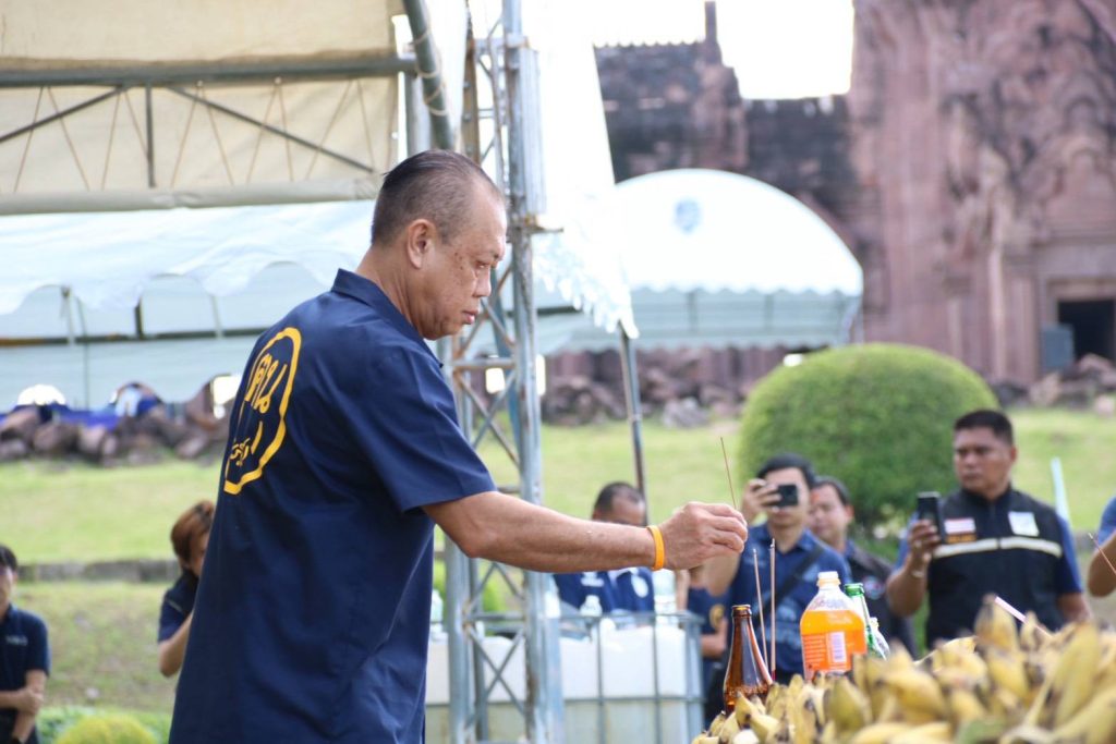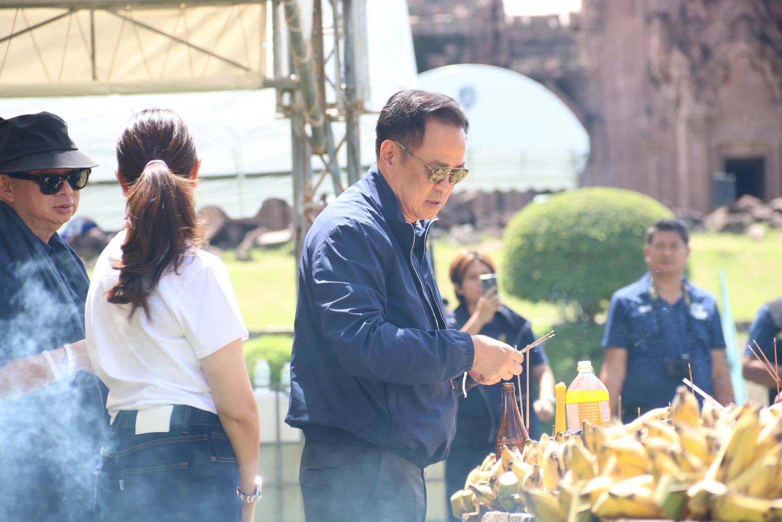 ทั้งนี้ เวลา 09:30 น. นายเนวินได้ขี่รถจักรยานยนต์ยี่ห้อเวสป้ามาถึงงาน ก่อนจะสักการะพระศิวะ ขึ้น ไปกราบศิวลึงค์ ภายในประสาทพนมรุ้งจำลอง แล้วจึงเดินเข้าสู่บริเวณพื้นที่จัดงาน ซึ่งจะต้องมีการจัดพิธีปะกำช้าง ที่ตระกูลชิกชอบ ถือปฏิบัติมาหลาย 10 ปีที่นายชัย ชิดชอบ เป็น ผู้ริเริ่มพิธีกรรมนี้มายาวนาน