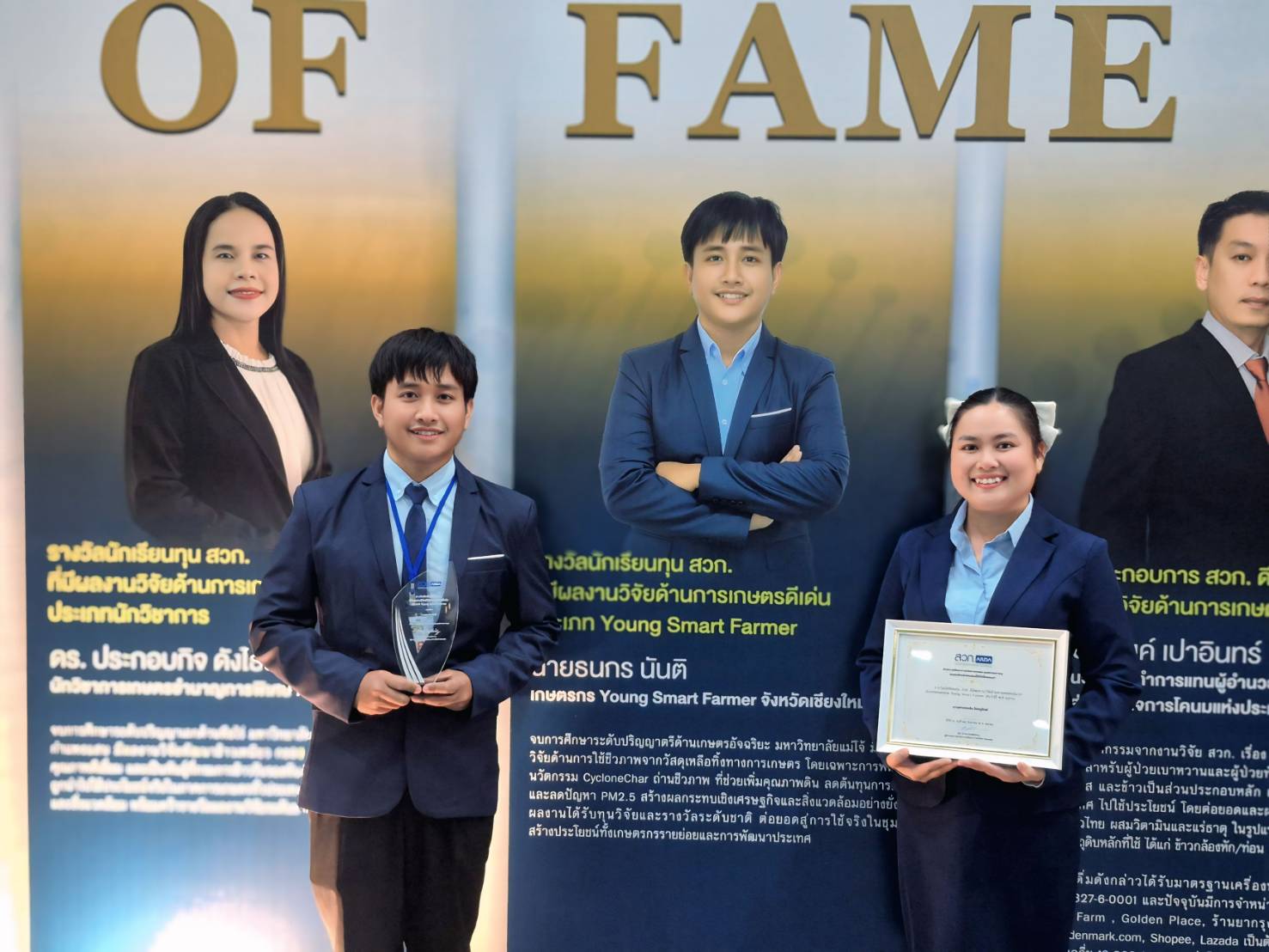 นายธนกร นันติ ได้รับรางวัลนักเรียนทุน สวก. ที่มี ผลงานวิจัยด้านการเกษตรดีเด่น ประเภท Young Smart Farmer จากผลงาน “ผลของการใช้ถ่านชีวภาพจากเศษวัสดุเหลือทิ้งทางการเกษตรที่แตกต่างกันต่อการ เจริญเติบโตของ HAWORTHIA” โดยมี ผู้ช่วยศาสตราจารย์ ดร.วาสนา วิรุญรัตน์ คณะผลิตกรรมการเกษตร เป็นอาจารย์ที่ปรึกษางานวิจัย