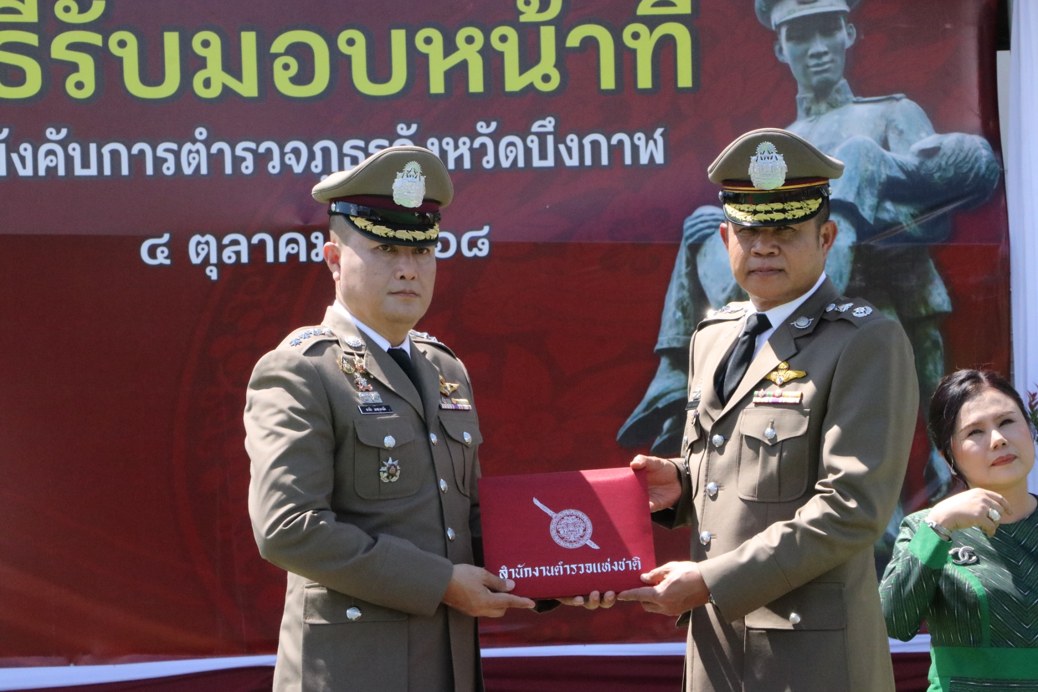 ผู้บังคับการตำรวจภูธรจังหวัดบึงกาฬ รับมอบหน้าที่ และมอบนโยบาย พร้อมปฏิญานตนต่อธงประจำหน่วย จะปฏิบัติหน้าที่ด้วยความซื่อสัตย์ และปกครองผู้ใต้บังคับบัญชาด้วยความเที่ยงธรรม