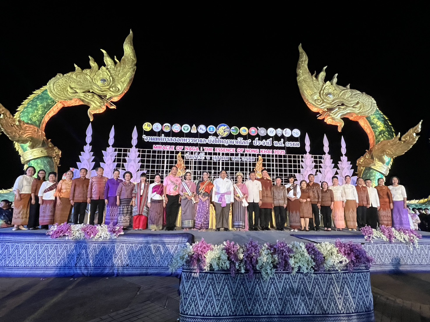 เมื่อช่วงค่ำวันนี้ (4 ต.ค. 68) ณ บริเวณลานวัฒนธรรม (พญานาคคู่) ริมฝั่งแม่น้ำโขง หน้าวัดลำดวน ในเขตเทศบาลเมืองหนองคาย จังหวัดหนองคาย โดยเทศบาลเมืองหนองคาย ได้จัดให้มีขบวนแห่เครื่องสักการะ พิธีบวงสรวงและรำบูชาพญานาค โดยมีนายสมภพ สมิตะสิริ ผู้ว่าราชการจังหวัดหนองคาย เป็นประธานในพิธีฯ มีนางรำทุกเพศทุกวัยจากชุมชนต่าง ๆ ในเขตเทศบาลเมืองหนองคาย ที่มีความเชื่อและศรัทธาต่อพญานาค จำนวนกว่า 1,000 คน แต่งตัวด้วยชุดผ้าพื้นเมืองของจังหวัดหนองคาย เข้าร่วมพิธีบวงสรวงและรำบูชาพญานาค มี พิ้งกี้ สาวิกา ไชยเดช ดารานักแสดง,กระเต็น กุลปริยา ฆ้อนทอง นางสาวไทย หนองคาย 2567 และแคท ชัญญธิดา มะติยาภักดิ์ มิสแกรนด์หนองคาย 2568 มาร่วมพิธีบวงสรวงและรำบูชาพญานาคในครั้งนี้ด้วย โดยมีนายสมหวัง อารีย์เอื้อ รองผู้ว่าราชการจังหวัดบึงกาฬ, นายณัฐพงศ์ คำวงศ์ปิน รองผู้ว่าราชการจังหวัดอุดรธานี,นายอรรถพร ภักดีสุจริต นายกเทศมนตรีเมืองหนองคาย นายวุฒิไกร ช่างเหล็ก นายกองค์การบริหารส่วนจังหวัดหนองคาย นางสาวกนกวรรณ ดุงศรีแก้ว ผอ.ททท.สำนักงานอุดรธานี นางอรัญญา กุลธัญวัฒน์ นายกสมาคมเวียดนามหนองคายพร้อมด้วยหัวหน้าส่วนราชการ คณะผู้บริหารเทศบาลเมืองหนองคาย ภาคเอกชน สมาคมและเข้าร่วมงานเป็นจำนวนมาก