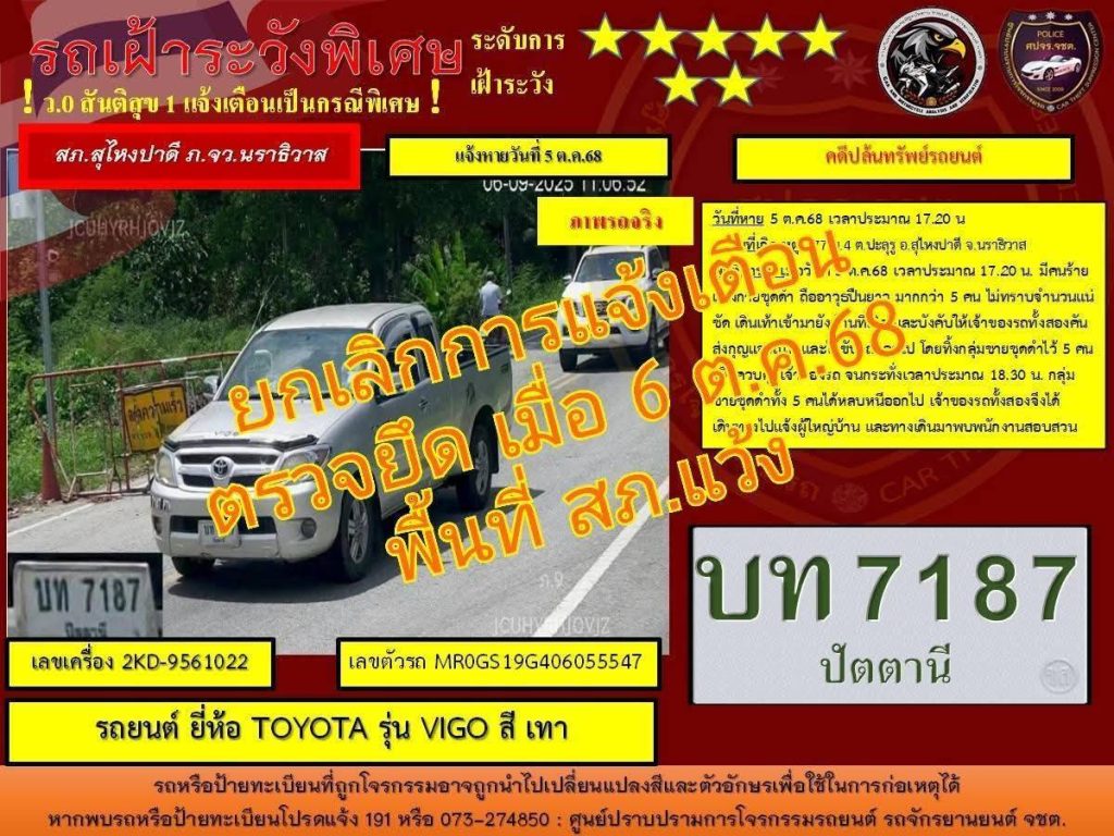 ส่วนรถยนต์กระบะ 2 คัน ที่ถูกจี้ชิงทรัพย์ กล้อง CCTV.จับภาพไว้ได้ คือ 1.กระบะโตโยต้าวีโก้ สีบรอนส์เงิน ทะเบียน บท 7187 ปัตตานี มีนายการี เต็ง เป็นผู้ครอบครอง และ 2.กระบะอีซูซุ ดีแทกซ์ 4 ประตู สีบรอนส์เงิน ทะเบียน กค 6521 นราธิวาส มีนายลุคมัน เจ๊ะมะ เป็นผู้ครอบครอง