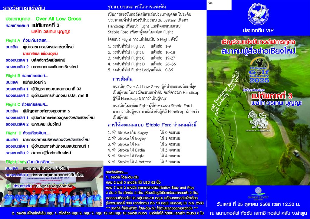 เชิญร่วมวาดวงสวิงกับ กอล์ฟการกุศล CM Reporter Assoc. Golf Charity 2025 Vol.2 ชิงถ้วยเกียรติยศ พลโท วรเทพ บุญญะ แม่ทัพภาคที่ 3