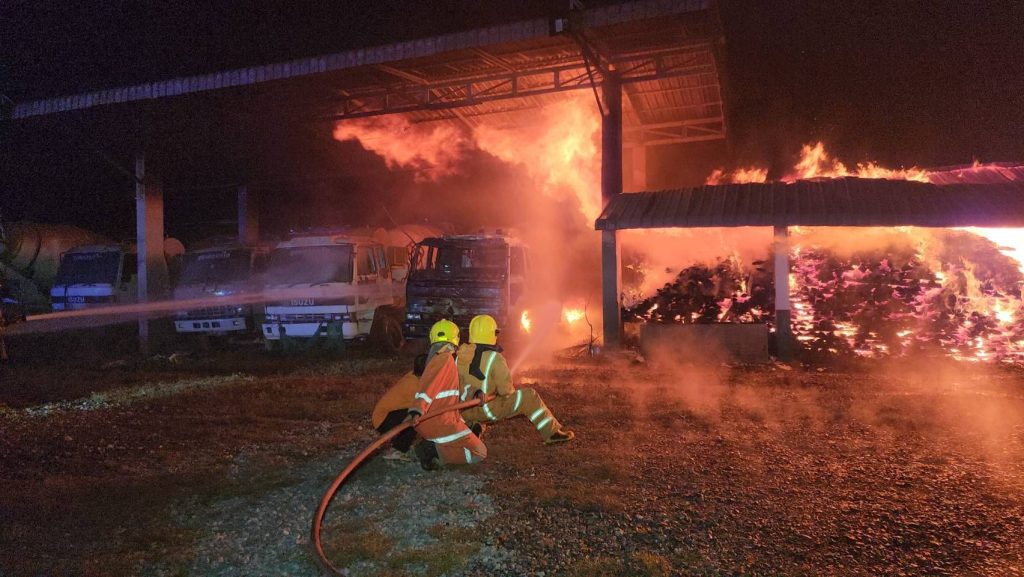 ไฟไหม้โกดังเก็บไม้สัก หจก.อุดมคอนกรีต เมืองน่าน เสียหายหนัก รถโม่ปูนวอด 1 คัน