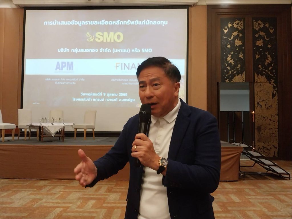 ที่ โรงเเรมไมด้า แกรนด์ ทวารวดี นครปฐม บริษัท กลุ่มสมอทอง จำกัด (มหาชน) หรือ SMO โดย ดร.สมภพ ศักดิ์พันธ์พนม ประธานกรรมการ บริษัท แอสแซท โปร แมเนจเม้นท์ จำกัด หรือ APM ในฐานะที่ปรึกษาทางการเงินของ บริษัท บริษัท กลุ่มสมอทอง จำกัด (มหาชน) หรือ SMO ได้เปิดเผยว่า บริษัทฯ เตรียมที่จะเดินทางไปนำเสนอข้อมูลกับนักลงทุน หรือ โรดโชว์ ของ SMO เพื่อเสนอขายหุ้นให้กับประชาชนเป็นครั้งแรก หรือ IPO จำนวน 321.60 ล้านหุ้น โดยจะเดินทางไปนำเสนอข้อมูลกับนักลงทุน 11 จังหวัด ประกอบด้วย จ.ชลบุรี (8 ต.ค.68) ราชบุรีและนครปฐม (9 ต.ค.68) พิษณุโลกและนครสวรรค์ (10 ต.ค.68) นครราชสีมาและขอนแก่น (14 ต.ค.68) เชียงใหม่ (15 ต.ค.68) อ.หาดใหญ่ จ.สงขลา (16 ต.ค.68) / สุราษฎร์ธานี (17 ต.ค.68) และ ปิดท้ายที่ กทม. (20 ต.ค.68)