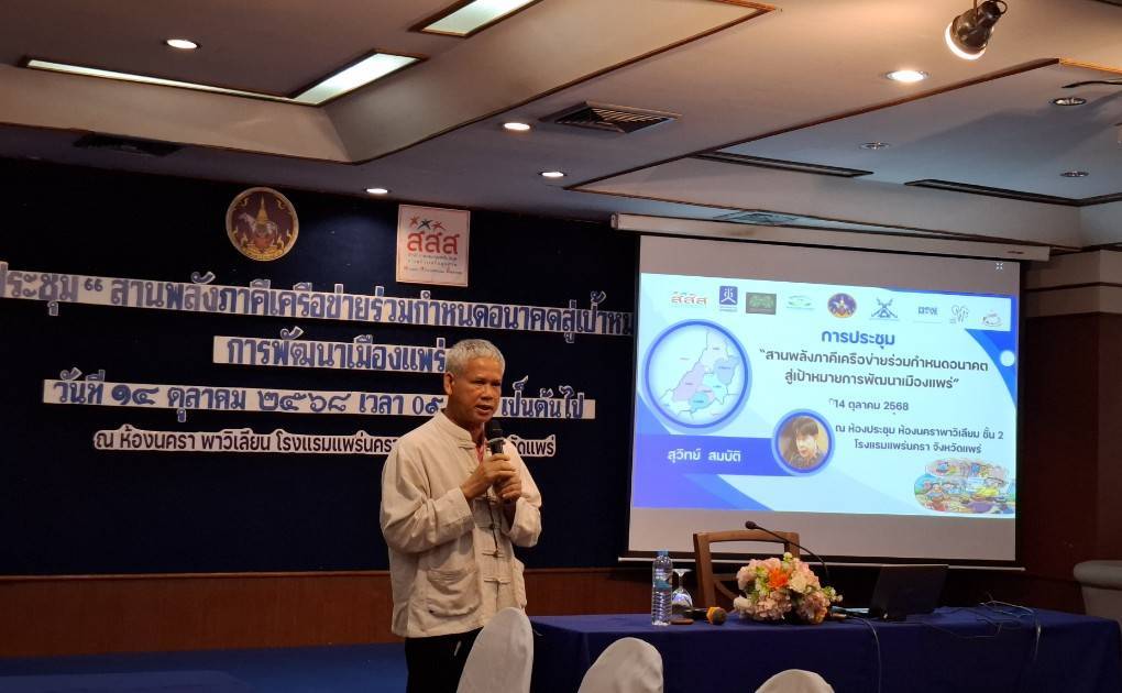 วันอังคารที่ 14 ตุลาคม 2568 เวลา 08.30 น. สมาคมภาคีพัฒนาจังหวัดแพร่ จัดประชุมสานพลังภาคีเครือข่ายร่วมกำหนดอนาคตสู่เป้าหมายการพัฒนาเมืองแพร่ เพื่อยกระดับกลไกและกระบวนการจัดทำนโยบายสาธารณะ การพัฒนาความร่วมมือให้มีการดำเนินการเป็นระบบ และขยายเครือข่ายการทำงานกับภาคีหน่วยงานต่าง ๆ เพื่อสร้างการรับรู้ในระดับจังหวัดร่วมกัน และสนับสนุนการขับเคลื่อนประเด็นนโยบายสาธารณะและแผนพัฒนาที่เป็นประเด็นร่วมของจังหวัดแพร่ โดยมีผู้รับผิดชอบจัดทำแผนพัฒนาจังหวัดแพร่เข้าร่วมเสนอข้อมูล จัดทำและเสนอประเด็นแผนยุทธศาสตร์