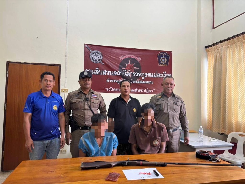 เมื่อวันที่ 14 ตุลาคม 2568 เวลาประมาณ 13.30 น. จากการอำนวยการโดย พ.ต.อ.รัฐวิชญ์ วศินพงศ์ธนัช ผกก.สภ.แม่สะเรียง ,พ.ต.ท.อลงกรณ์ พรหมตา รอง ผกก.สส.ฯ ,พ.ต.ท.จักษ์พัฒน์ ดอกจันทร์ รอง ผกก.ป.ฯ,พ.ต.ท.พิเชษฐ์ ถาทวี สวป.ฯ,พ.ต.ท.บัญชา ชำนาญ สว.สส.ฯรายนามเจ้าหน้าที่ชุดจับกุม นำโดย พ.ต.ท.จักษ์พัฒน์ ดอกจันทร์ รอง ผกก.ป.ฯ,ร.ต.ท.สุวิทย์ แสงสุริยันต์,ด.ต.เจริญผล แสพลกรัง,ด.ต.จักรพันธ์ รัตนา ,ด.ต.เกิดพงษ์ มาสัก ร่วมกับกำนันต.แม่เหาะ,ผรส. ได้เข้าทำการจับกุม นายคำนวล ไม่มีชื่อสกุล อายุ 36 ปี และ นายซูติ ไม่มีชื่อสกุล อายุ 57 บริเวณกระท่อมไม่มีเลขที่ริมถนนบริเวณบ้านแม่ลิดป่าแก่ หมู่ 1 ต.แม่เหาะ อ.แม่สะเรียง จว.แม่ฮ่องสอน พร้อมด้วยของกลาง 1.ยาเสพติดให้โทษประเภท 1(ยาบ้า)เม็ดสีส้ม ประทับตรา WY ด้านเดียว จำนวน 90 เม็ด เม็ดสีเขียว ประทับตรา WY ด้านเดียว จำนวน 2 เม็ด อยู่ในขวดพลาสติกฝาสีแดง พันด้วยเทปพันสายไฟสีดำ อยู่ในซองซิปแบบกดปิดเลื่อนเปิดสีชา ซุกซ่อนในกระเป๋าสีดำแบบคาดอกวางอยู่พื้นกระท่อม 2.อาวุธปืนยาวแบบประดิษฐ์เอง(ปืนแก๊ป) จำนวน 1 กระบอก วางอยู่บนพื้นดินข้างจักรยานยนต์
