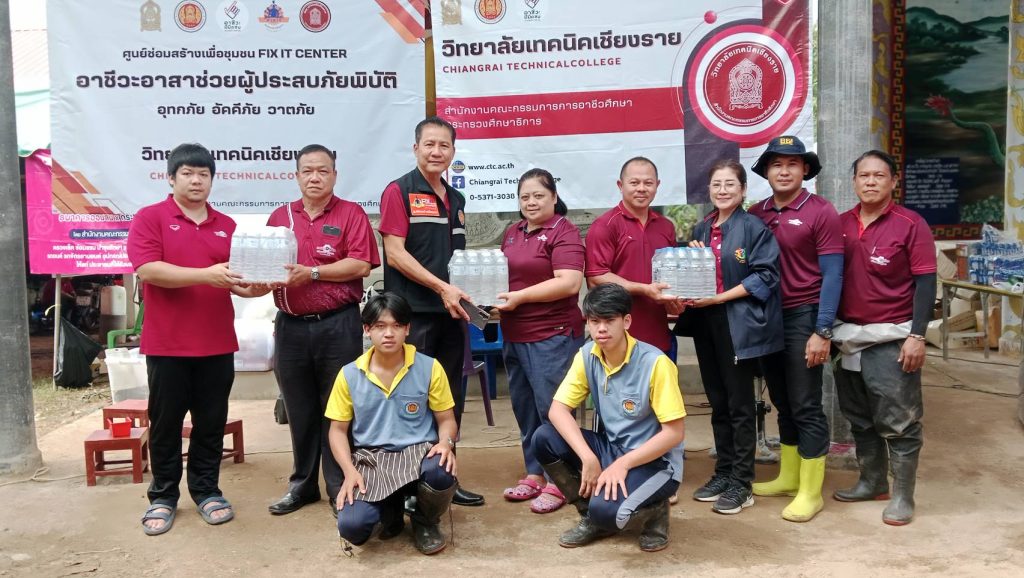 ดร.ปรีชา ภู่สมบัติขจร ประธานอาชีวศึกษาอุตรดิตถ์/ผู้อำนวยการวิทยาลัยเทคนิคอุตรดิตถ์ นายพิทยาธรณ์ แจ่มีศรี รองผู้อำนวยการวิทยาลัยเทคนิค นางสาวธัญญ์พิชชา ท้วมทับ รองผู้อำนวยการวิทยาลัยเทคนิคอุตรดิตถ์ ร่วมกันลงพื้นที่เยี่ยมเยียนหน่วยอาชีวะอาสาร่วมด้วยช่วยประชาชนและมอบเครื่องอุปโภคบริโภคให้กับครอบครัวนักศึกษาที่ประสบอุทกภัย 41 รายในพื้นที่อำเภอทองแสนขัน