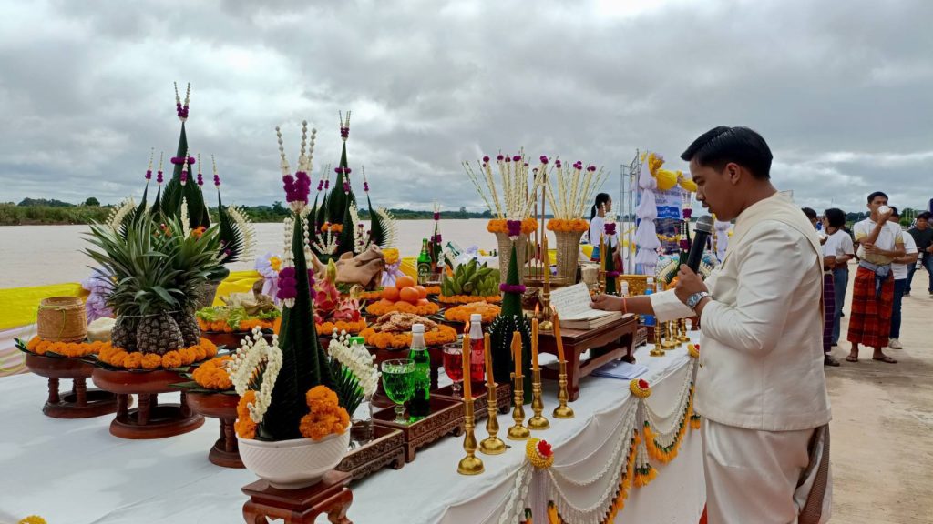 จเรทหาร บวงสรวงสิ่งศักดิ์สิทธิ์เตรียมสร้างเขื่อนป้องกันตลิ่งบนเกาะดอนต่ำกลางน้ำโขงของไทย