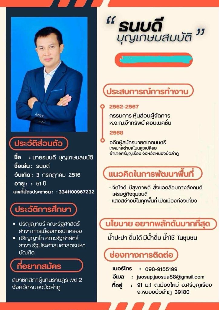 สำหรับ จุดเด่นจุดแข็งและแนวคิด “ธนบดี บุญเกษมสมบัติ” ว่าที่ผู้สมัคร ส.ส.เขต 2 หนองบัวลำภู คนในเขต “หนองบัวลำภู 2 จะเกิดการเปลี่ยนแปลง ผู้คนจิตใจดี มีสุขภาพดี สิ่งแวดล้อมทางสังคมดี เศรษฐกิจชุมชนดี แสงสว่างมีในทุกพื้นที่ พร้อมเปิดเมืองท่องเที่ยว ภายใต้นโยบายที่จะผลักดัน น้ำประปา ดื่มได้ มีน้ำดื่ม น้ำใช้ในชุมชน นี่ ไม่ใช่แค่คำพูดเท่านั้น จะต้องทำให้เห็นเป็นจริงในเวทีการเมืองปี 69 รัก“ธนบดี บุญเกษมสมบัติ” อดีตผู้ติดตามผู้บริหาร บริษัท บี อี ซี เทโร ไทยทีวีสี ช่อง 3 CH.3 ตทอ.ศรีบุญเรือง พรรคก้าวไกล สมาชิกพรรคประชาชน ขอเปลี่ยนสีเสื้อใหม่ ตามอุดมการณ์ เจตนารมณ์เดิม เพื่อการเปลี่ยนแปลงหนองบัวลำภู เขต 2