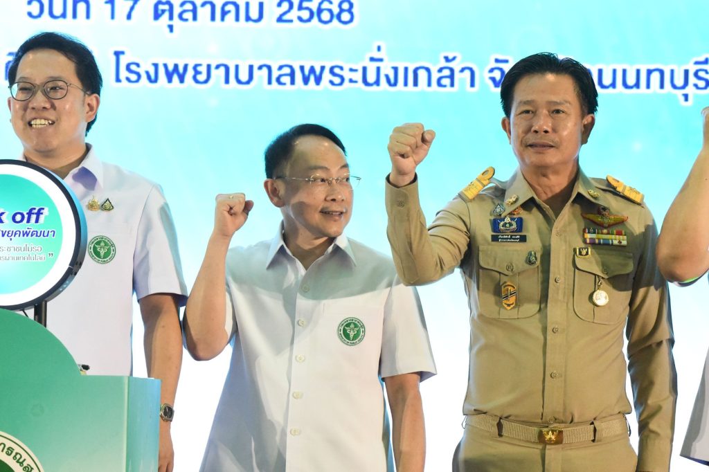 วันนี้ (17 ตุลาคม 2568) นายพัฒนา พร้อมพัฒน์ รัฐมนตรีว่าการกระทรวงสาธารณสุข Kick off สาธารณสุขยุคพัฒนา “หมอไม่ล้า ประชาชนไม่รอ เชื่อมต่อทุกบริการผ่านเทคโนโลยี” ที่ โรงพยาบาลพระนั่งเกล้า จังหวัดนนทบุรี โดยมี นายแพทย์สมฤกษ์ จึงสมาน ปลัดกระทรวงสาธารณสุข นายเกียรติศักดิ์ ตรงศิริ ผู้ว่าราชการจังหวัดนนทบุรี ผู้บริหารกระทรวงสาธารณสุขเขตสุขภาพที่ 4 ร่วมงาน พร้อมกับอีก 3 แห่ง ได้แก่ โรงพยาบาลพุทธชินราช จังหวัดพิษณุโลก โดยนายวรโชติ สุคนธ์ขจร รัฐมนตรีช่วยว่าการกระทรวงสาธารณสุข, โรงพยาบาลบางบ่อ จังหวัดสมุทรปราการ โดย ผศ.อัครนันท์ อริยศรีพงษ์ ที่ปรึกษารัฐมนตรีช่วยว่าการกระทรวงสาธารณสุข และ โรงพยาบาลพหลพลพยุหเสนา จังหวัดกาญจนบุรี โดย นายแพทย์วีรวุฒิ อิ่มสำราญ รองปลัดกระทรวงสาธารณสุข