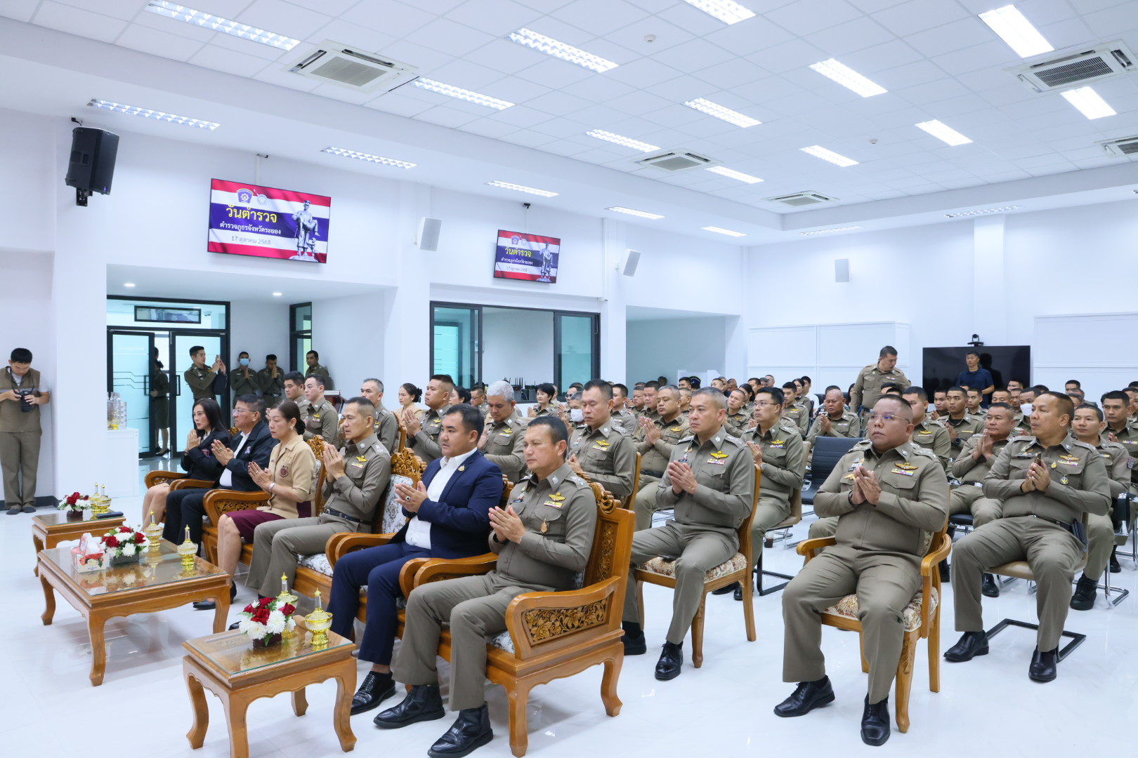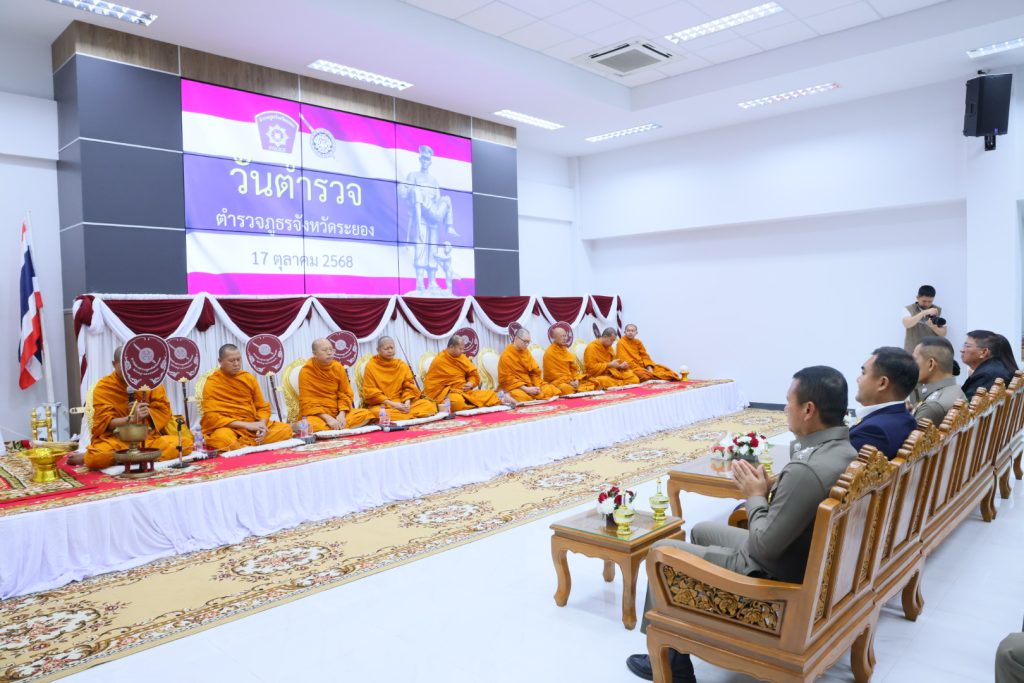 เมื่อเวลา 09.30 น. วันที่ 17 ต.ค.68 ที่ห้องประชุมกองบังคับการตำรวจภูธรจังหวัดระยอง ต.ท่าประดู่ อ.เมือง จ.ระยอง พล.ต.ต.ปราโมทย์ งามประดิษฐ์ ผบก.ภ.จว.ระยอง เป็นประธานในงานวันตำรวจแห่งชาติ ตำรวจภูธรจังหวัดระยอง ประจำปี 2568 ซึ่งในงานได้จัดให้การทำบุญถวายภัตตาหารปิ่นโต และเครื่องไทยธรรมแด่พระสงฆ์ จำนวน 9 รูป เพื่อความเป็นสิริมงคล มอบทุนส่งเสริมการศึกษาแก่บุตรข้าราชการตำรวจภูธรจังหวัดระยองเด็กพิเศษตาม ‘โครงการครอบครัวตำรวจ เราไม่ทิ้งกัน’ จำนวน 3 คน และทุนการศึกษาบุตรข้าราชการตำรวจภูธรจังหวัดระยองสมาชิกสหกรณ์ออมทรัพย์ตำรวจภูธรจังหวัดระยอง จำนวน 28 คนด้วย โดยการจัดขึ้นงานวันตำรวจแห่งชาติ ตำรวจภูธรจังหวัดระยอง ประจำปี 2568 ดังกล่าว มี พ.ต.อ.สมฤกษ์ ค้ำชู, พ.ต.อ.ทนุเนตร ปิตุเตชะ พ.ต.อ.จิราวัฒน์ ศักดิ์ศรีวัฒนา, พ.ต.อ.กุลชัย กุลชาติ และ พ.ต.อ.มานพ ภุชชงค์ รอง ผบก.ภ.จว.ระยอง พ.ต.อ.อาทิตย์ ยาแก้ว ผกก.สภ.เมืองระยอง ข้าราชการตำรวจสังกัดตำรวจภูธรจังหวัดระยอง แม่บ้านตำรวจภูธรจังหวัดระยอง และกต.ตร.ระยอง ร่วมเป็นเกียรติในงานฯ โดยหลังเสร็จพิธีการยังได้มีการรับประทานอาหารร่วมกันอีกด้วย
