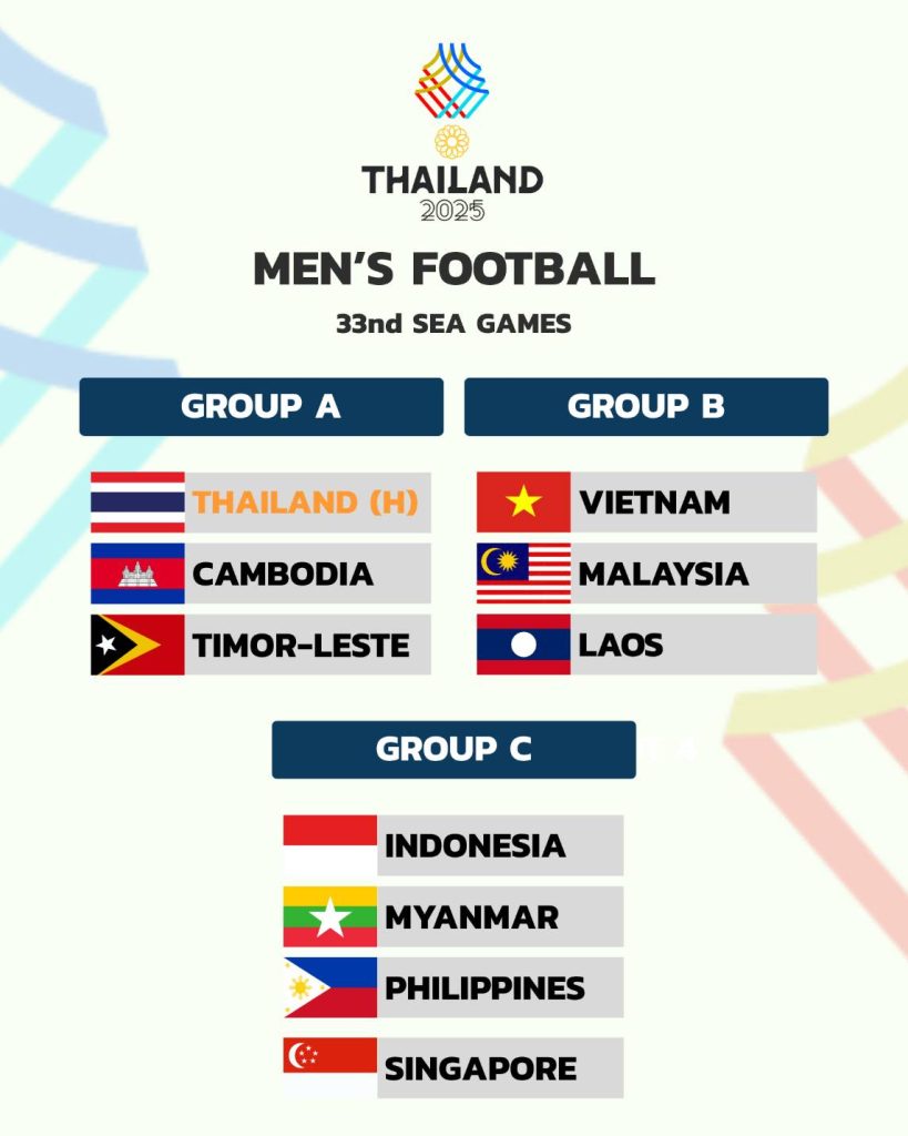 สำหรับฟุตบอลทีมชาติไทยชุดซีเกมส์อยู่กลุ่มเอ ร่วมกับกัมพูชา, ติมอร์เลสเต กลุ่มบี เวียดนาม, มาเลเซีย, ลาว และกลุ่มซี อินโดนีเซีย, เมียนมา, ฟิลิปปินส์, สิงคโปร์