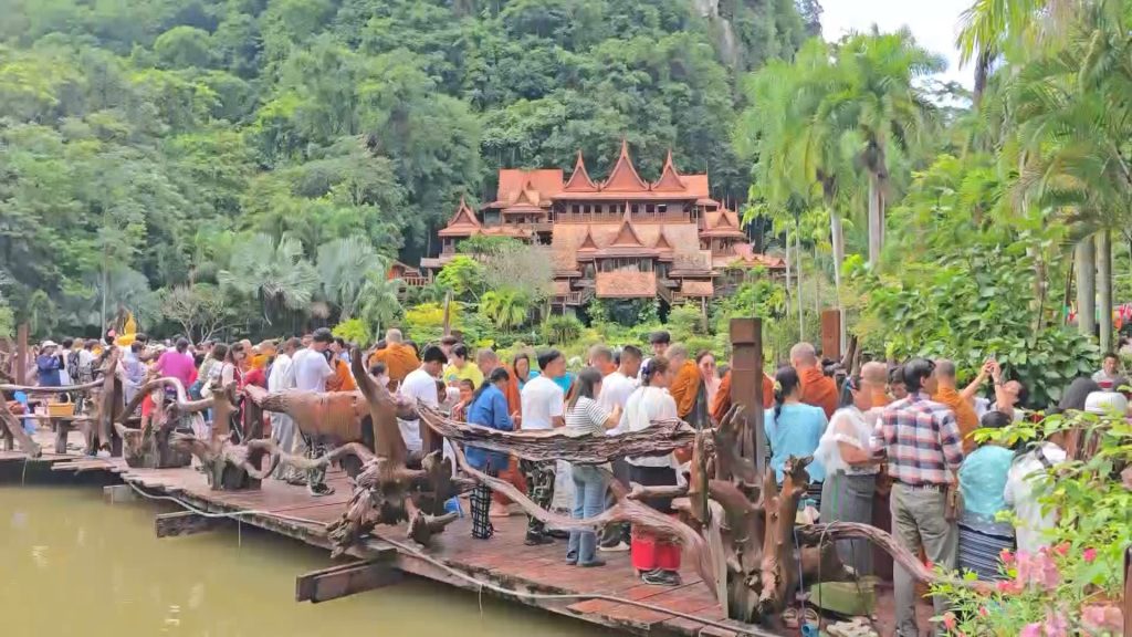 สีสัน วัดถ้ำเขาวง วัดสวย อุทัยธานี Unseen Thailand ท่ามกลางธรรมชาติกลางขุนเขา ตำบลบ้านไร่ อำเภอบ้านไร่ จังหวัดอุทัยธานี จัดงานสืบสานประเพณีตักบาตรเทโว พุทธศาสนิกชนร่วมตักบาตรข้าวสาร อาหารแห้ง ลูกอม กันอย่างชื่นมื่น ระหว่างพระสงฆ เดินรับบิณฑบาตรเป็นภาพที่สวยงามมีฉากหลังเป็นศาลาทรงไทย และพระพุทธไสยาส “พระอุทัยธรรมพินิต” ขณะที่มีพระสงฆ์รูปหนึ่งมาสร้างสีสันเป็นอินฟูอินเซอร์มาไลน์สดใช้กล้องโทรศัพท์ถึง 3 เครื่อง อีกด้วย