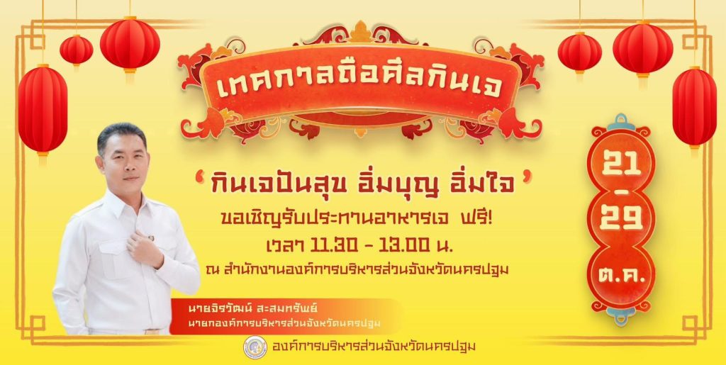 องค์การบริหารส่วนจังหวัดนครปฐม จัดงานเทศกาลถือศีลกินเจ ประจำปี พ.ศ. 2568 โดยจัดอาหารเจ ให้ทานฟรี ตลอดระยะเวลา 9 วัน ระหว่างวันที่ 21-29 ตุลาคม ตั้งแต่เวลา 11.30-13.00 น.