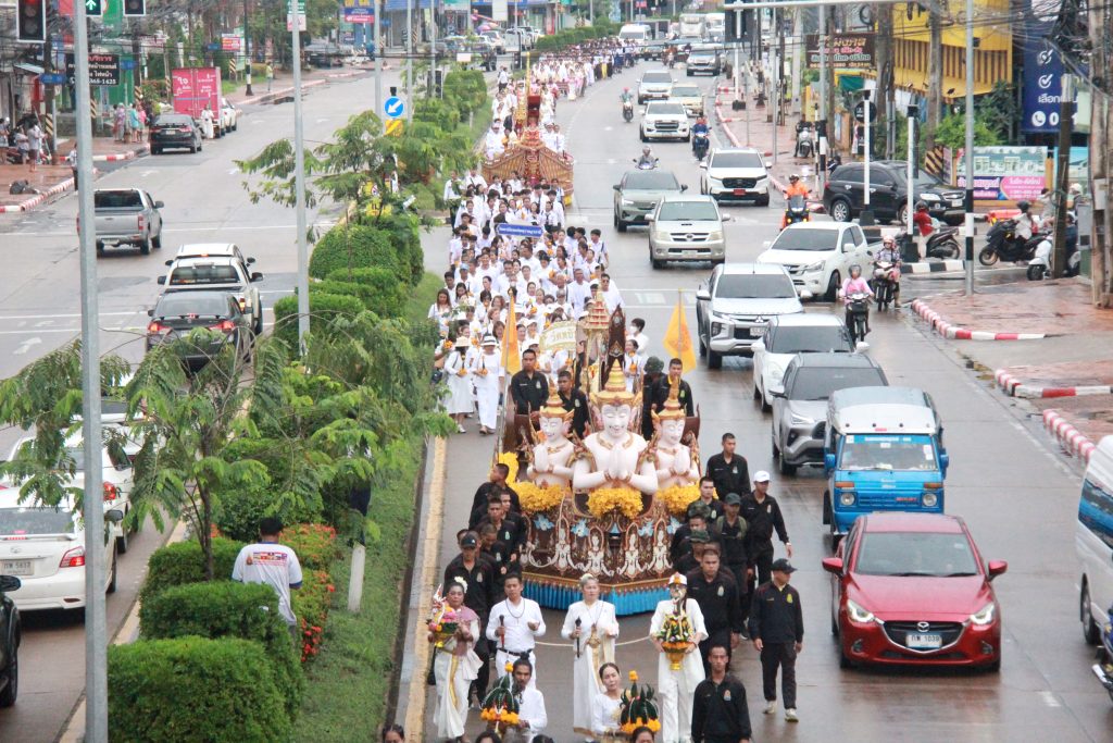 วันนี้ (24 ต.ค.68) สภาส่งเสริมวัฒนธรรมอาเซียน นำโดยเจ้าศรีรัตน์ ณ ลำปาง ประธานที่ปรึกษาสภาส่งเสริมวัฒนธรรมอาเซียน นางสาวจุฑามาศ ณ สงขลา ผู้อำนวยการโครงการจรรโลงพระพุทธศาสนา พร้อมด้วยคณะเจ้าหน้าที่ และข้าราชการ หน่วยงานภาครัฐ องค์กรเอกชน นักเรียน นักศึกษา และพุทธศาสนิกชนจังหวัดสุราษฎร์ธานีต่างพร้อมใจกันใส่ชุดขาว ร่วมพิธีอัญเชิญพระบรมสารีริกธาตุจากพุทธคยา รัฐวิหาร ประเทศอินเดีย มาประดิษฐานเป็นการชั่วคราว ณ วัดกลางใหม่ ภายใต้ “โครงการส่งเสริมและจรรโลงพระพุทธศาสนา ส่งเสริมศิลปะและวัฒนธรรม” โดยเคลื่อนขบวนจากโรงแรมวังใต้ไปตามถนนศรีวิชัย ผ่านหมวดทางหลวงสุราษฎร์ธานี โรงพยาบาลสุราษฎร์ธานี สิ้นสุดที่วัดกลางใหม่ รวมระยะทางประมาณ 2 กิโลเมตร มีผู้เข้าร่วมกว่า 1,000 คน